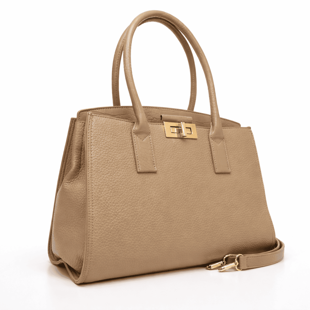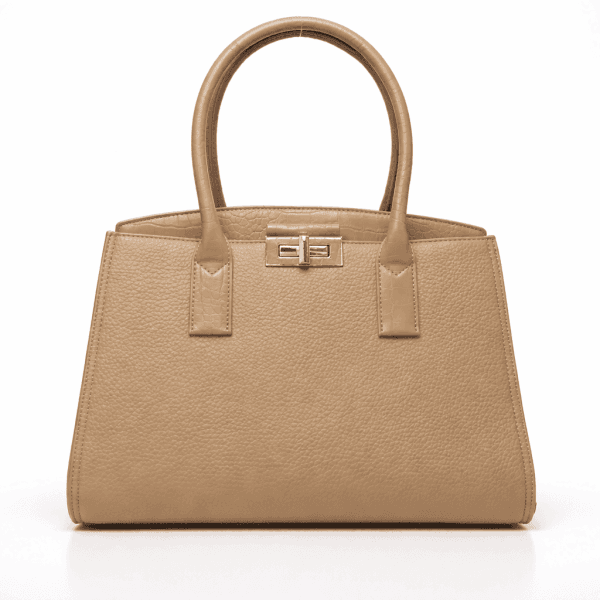 Тази дамска чанта от еко кожа е създадена за жени, които харесват изчистената елегантност, но държат и на удобството в ежедневието. Моделът съчетава класически силует, модерно излъчване и нежен бежов тон, който лесно се комбинира както с делова визия, така и с по-небрежен градски стил.