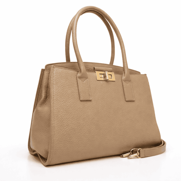 От снимките личи балансираната форма с твърда конструкция, фина релефна текстура и красив акцент в горната част и при основата на дръжките. Златистата закопчалка придава завършен и луксозен вид, а дългата регулируема дръжка дава повече свобода при носене. Гърбът е изчистен, което подчертава минималистичния и подреден характер на модела.
