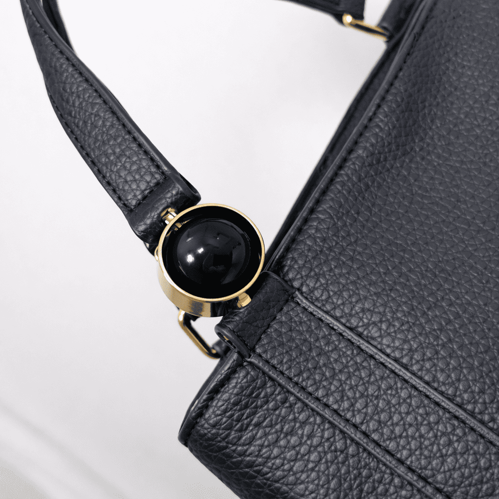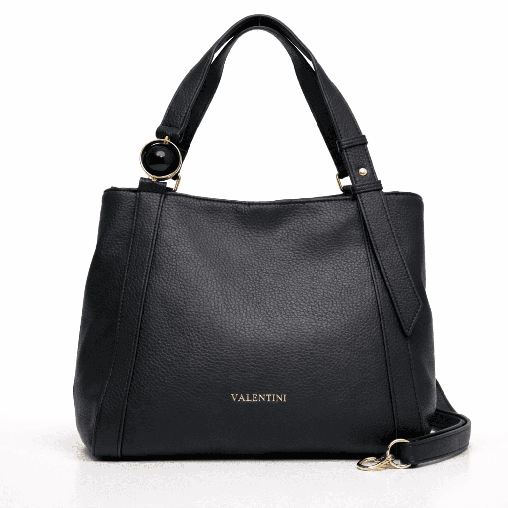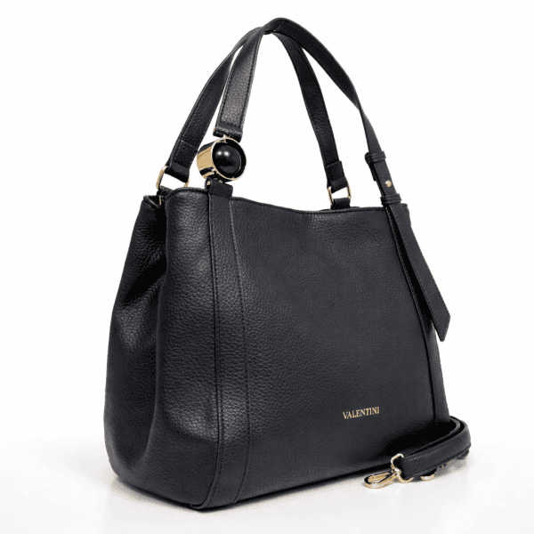 Снимките показват красиво структурирана форма с мека релефна текстура и чисти линии. Златистите метални елементи внасят фина доза лукс, а впечатляващият декоративен акцент при едната дръжка добавя дизайнерски почерк и отличима визия. На гърба е разположен практичен външен джоб с цип, а дългата регулируема дръжка позволява чантата да се носи удобно според предпочитанието и повода.
