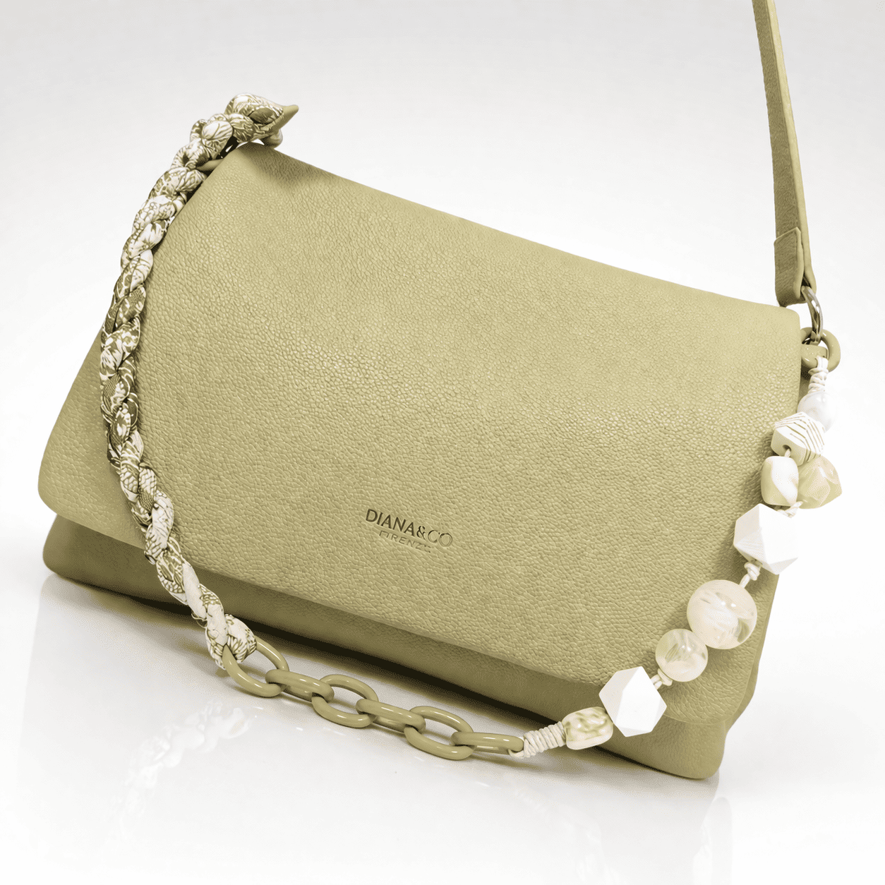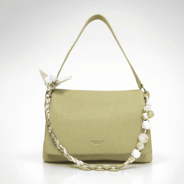 Свежа, модерна и различна – тази дамска чанта в мек зелен нюанс привлича вниманието с  декоративна верижка с акцентни елементи. Комбинира стил и удобство, като придава характер на всяка визия.Приблизителни размери: ширина дъно 11 см, дължина дъно 33 см, височина без дръжки 22см. ВСИЧКИ СТОКИ СЕ ДОСТАВЯТ С ПРЕГЛЕД И ТЕСТ! БЕЗПЛАТНА ДОСТАВКА за заявки над 80.00 лева до офис на транспортна фирма! ДИРЕКТНА ПОРЪЧКА на телефон 0878309969. Каталожен номер 920-2Z.