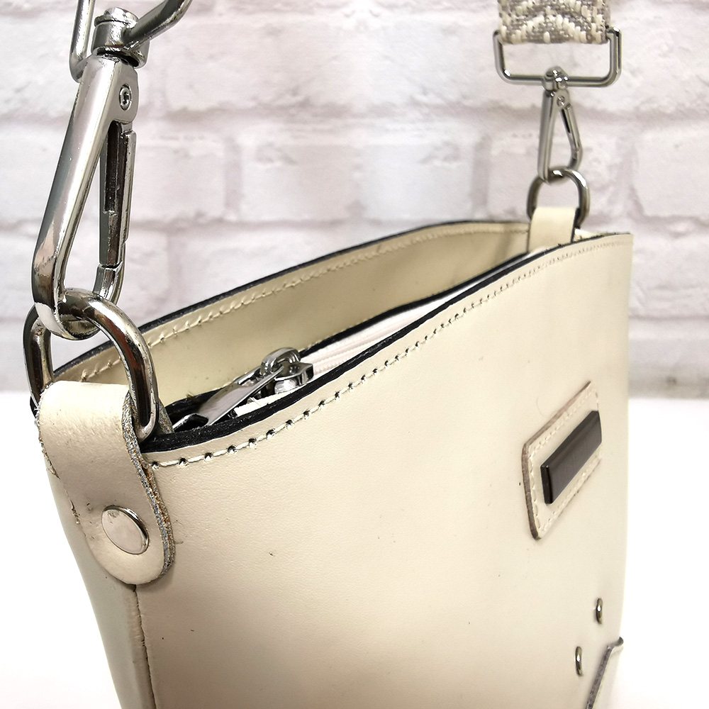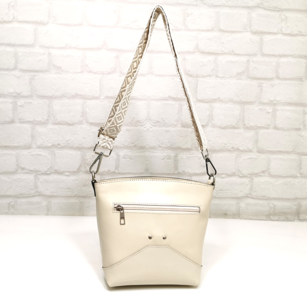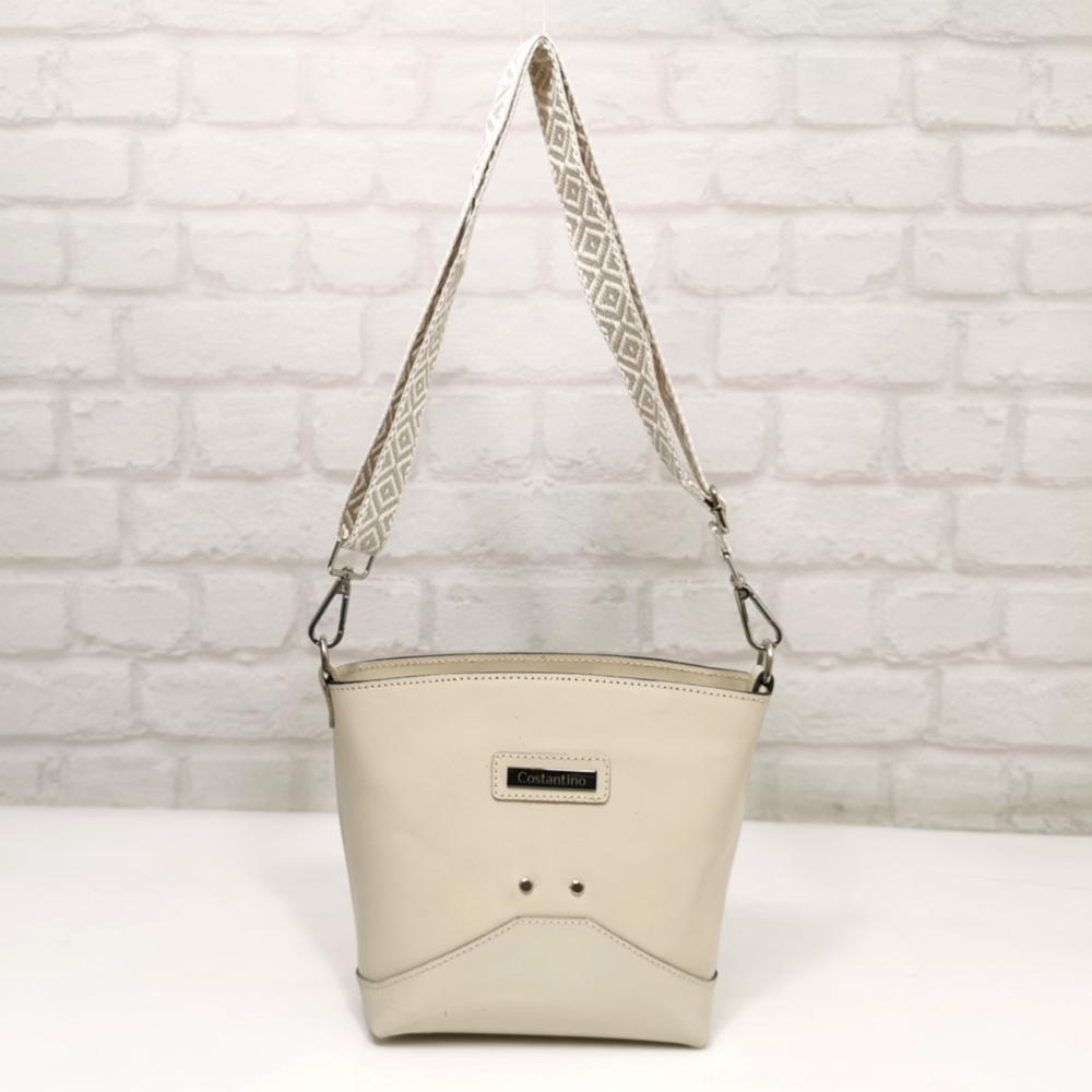Дамска чанта от гланцирана естествена кожа в универсален екрю цвят, с практично разпределение и модерна широка текстилна дръжка. Има удобен външен джоб на гърба на чантата. Произведена в България!
