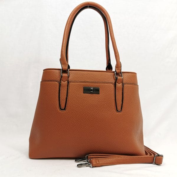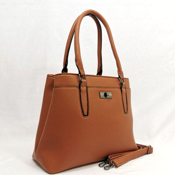Красива дамска чанта цвят камел в по-елегантен стил с пректично разпределение. Има дълга регулираща се дръжка и удобно може да се носи в стил крос боди със свободни ръце.