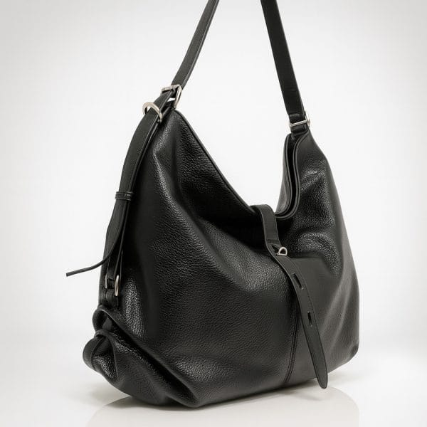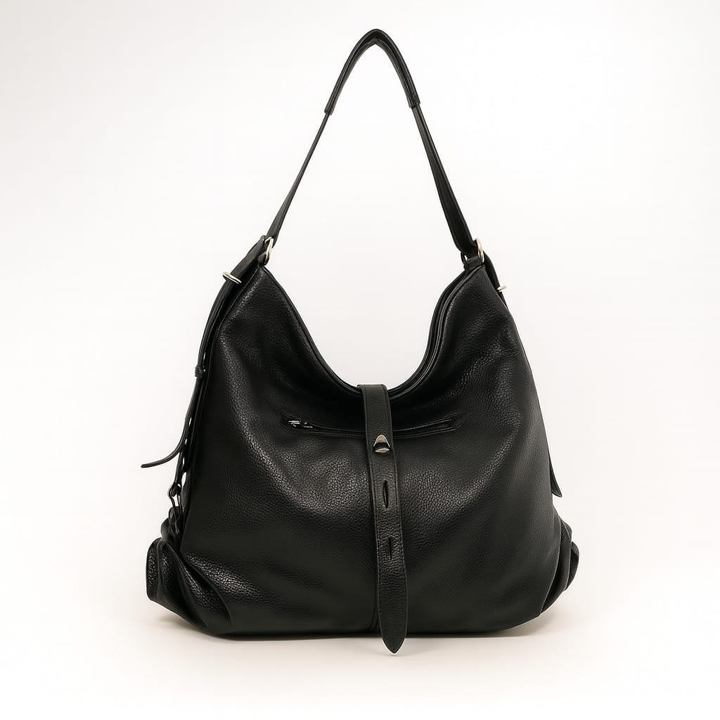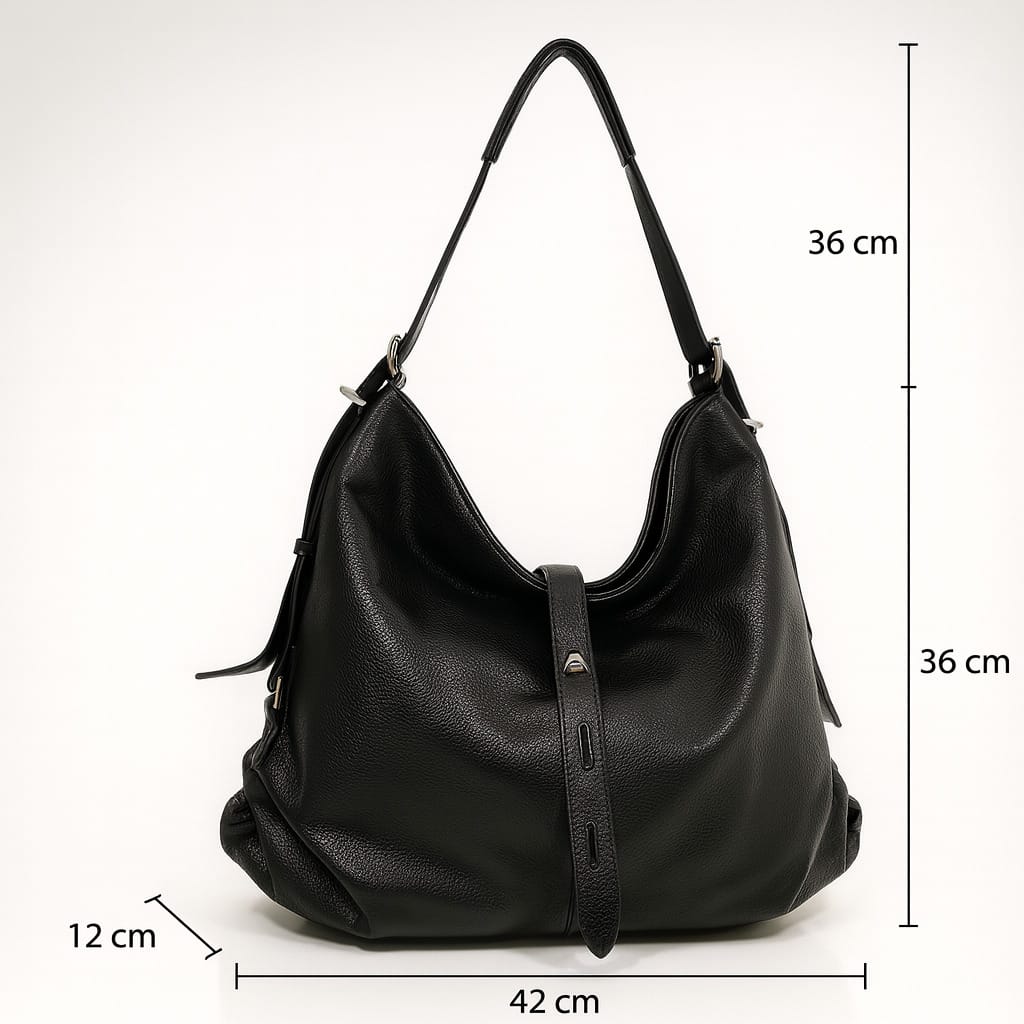 Голяма черна дамска чанта от еко кожа, създадена за динамичното ежедневие, в което имате нужда от стил и пространство в едно. Меката й, леко падаща форма стои модерно на рамо, а текстурата на материала придава усещане за плътност и качество. Декоративната кожена лента в предната част подсилва силуета и е фин акцент, който привлича погледа и съчевременно коригира обема при необходимост.
