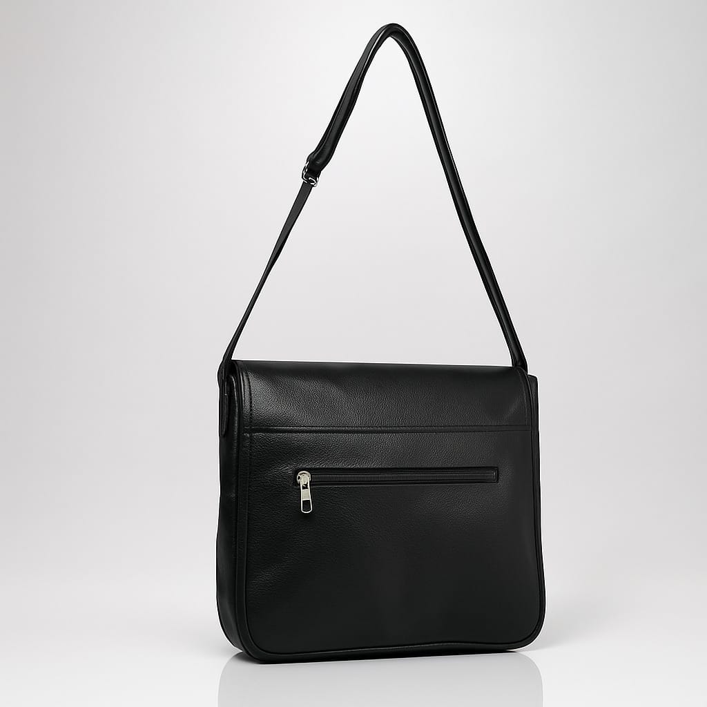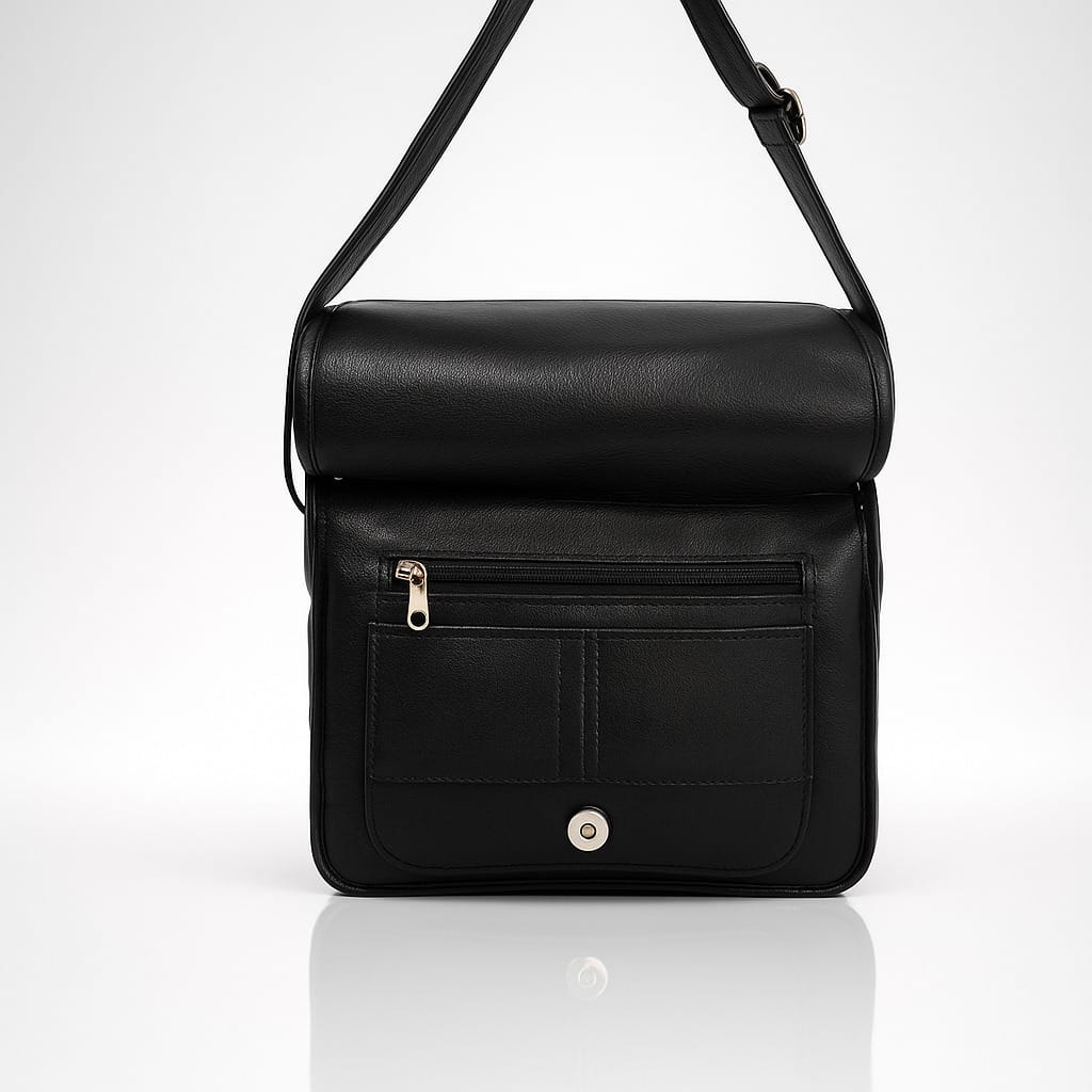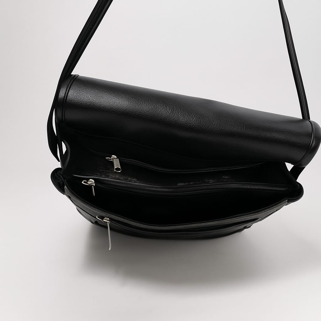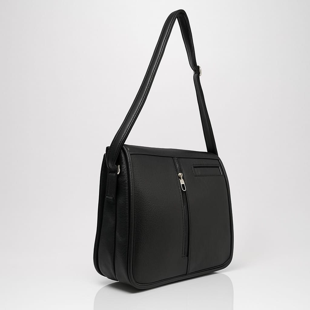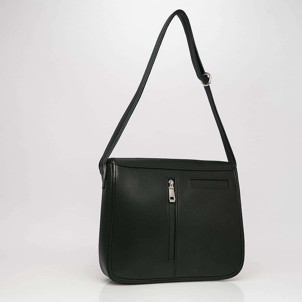 Тази дамска чанта от еко кожа съчетава минималистичен силует и практичност за ежедневна употреба. Черният ѝ цвят подчертава елегантността, а капакът с цип осигурява сигурност и удобство. Вертикалният преден джоб с цип добавя стилен акцент и лесен достъп до най-необходимото. Вътрешността е разделена на прегради, подходящи за организация на вещите.