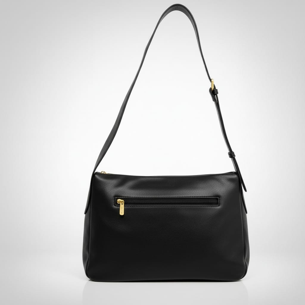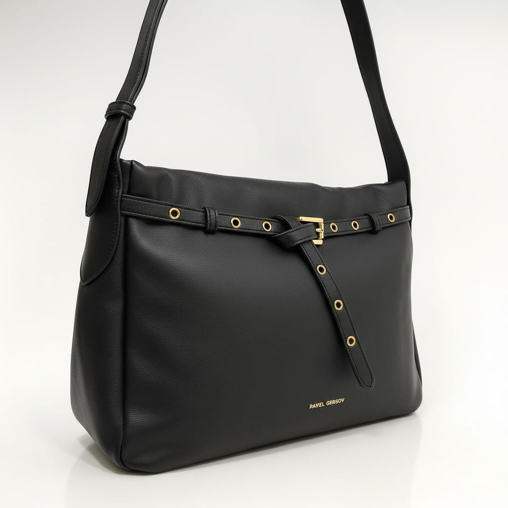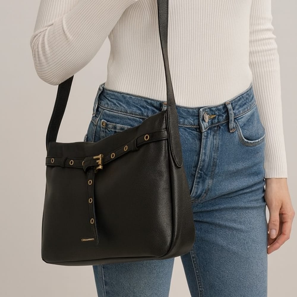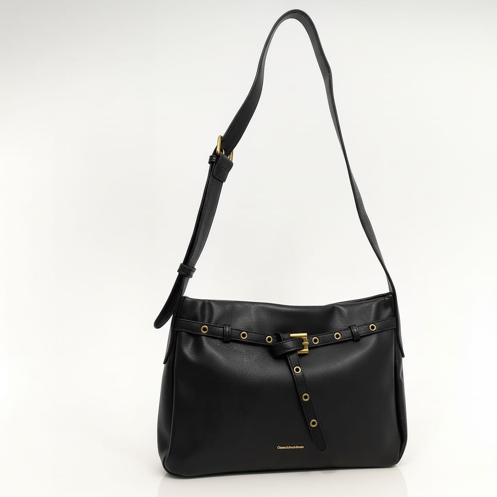 Тази дамска чанта от еко кожа с оригинален дизайн на френската марка David Jones е създадена за жени, които искат да са модерни и впечатляващи. Класическият черен цвят е чудесно се съчетава, както с офис облекло, така и с ежедневни дънки и любими маратонки. Предната част е подчертана с декоративен колан с метални отвори и малка златиста катарама, а дискретното лого добавя стилен завършек. На гърба ще откриете удобен външен джоб с цип за вещи, които искате да са винаги под ръка. Вътрешността е практично организирана с два джоба, така че телефонът и документите да имат своето място. Регулируемата дълга дръжка позволява чантата да се носи както на рамо, така и крос-боди – според настроението и стила ви.