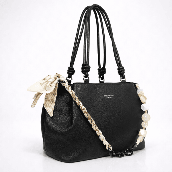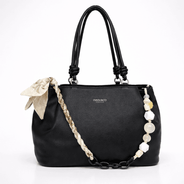 Дамска чанта с три прегради във винаги модерния черен цвят, която лесно се комбинира с ежедневни и по-елегантни визии. Моделът предлага удобство, добра вместимост и фин декоративен акцент за по-завършен стил. Дръжките са удобни за носене на рамо.