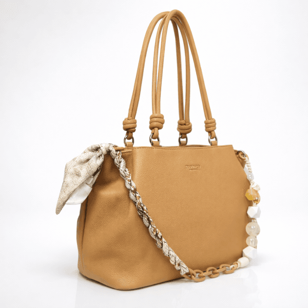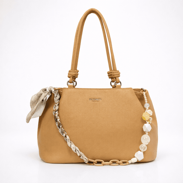 Дамска чанта с три прегради Diana Co в универсален бежов цвят, която лесно се комбинира с ежедневни и по-елегантни визии. Моделът предлага удобство, добра вместимост и фин декоративен акцент за по-завършен стил. Дръжките са удобни за носене на рамо.