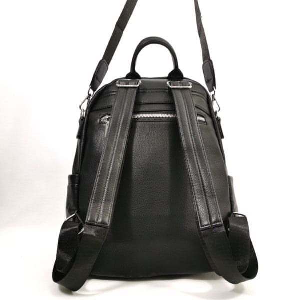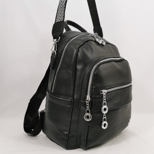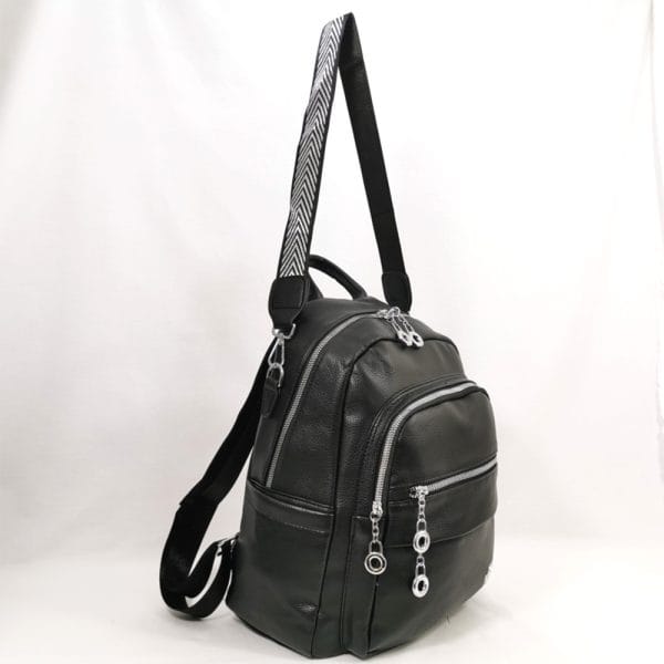 Две регулиращи се дръжки, комбинация от еко кожа и текстилна лента, една подвижна текстилна дълга дръжка с бели орнаменти, за носене на раницата на едно рамо, като чанта и една къса дръжка.
