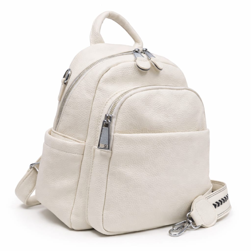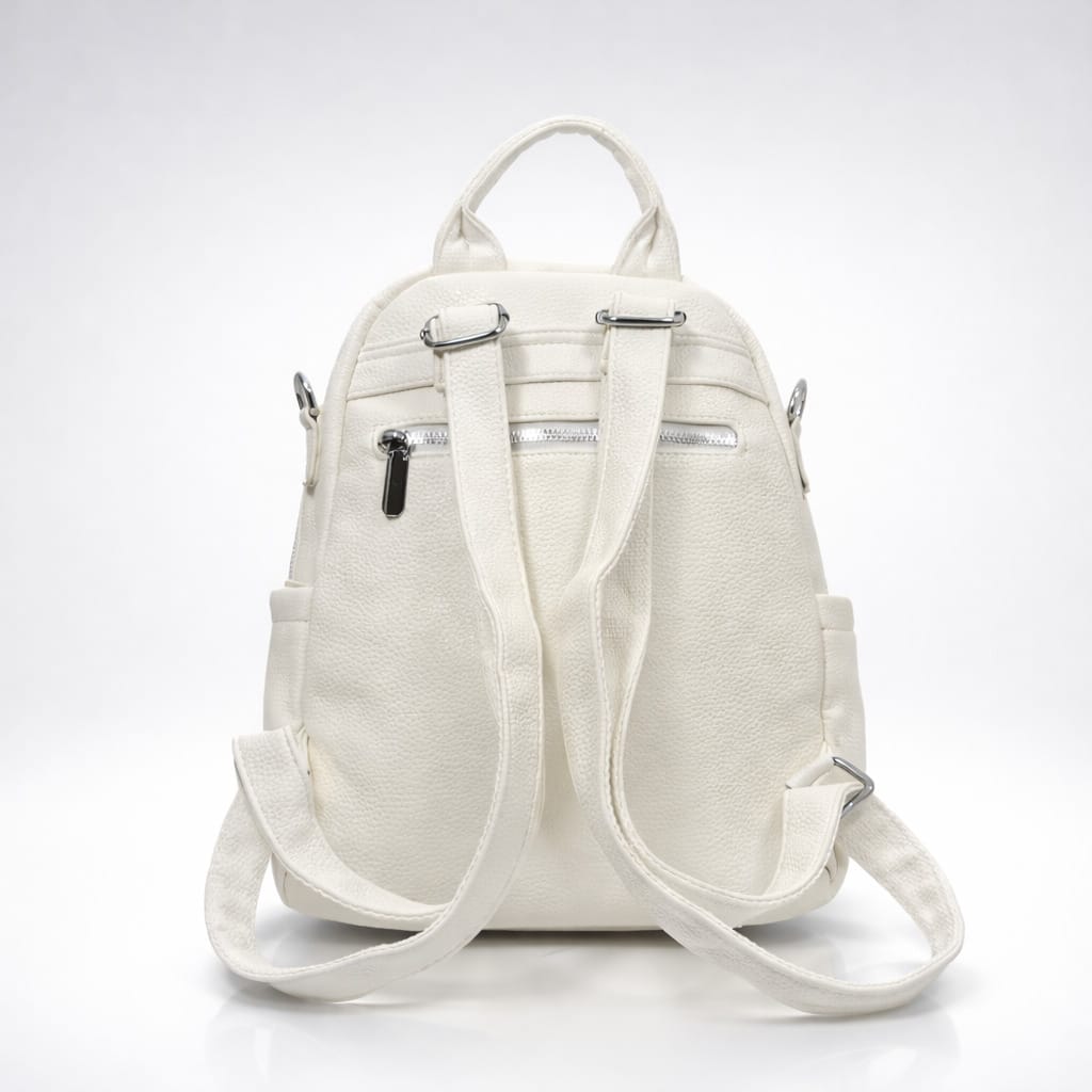 Тази дамска раница от еко кожа е създадена за жени, които търсят едновременно изчистен стил и практичност в ежедневието. Белият цвят придава свежо и модерно излъчване, а компактният силует я прави лесна за комбиниране с различни визии. Тя е онзи аксесоар, който стои деликатно, но върши сериозна работа.