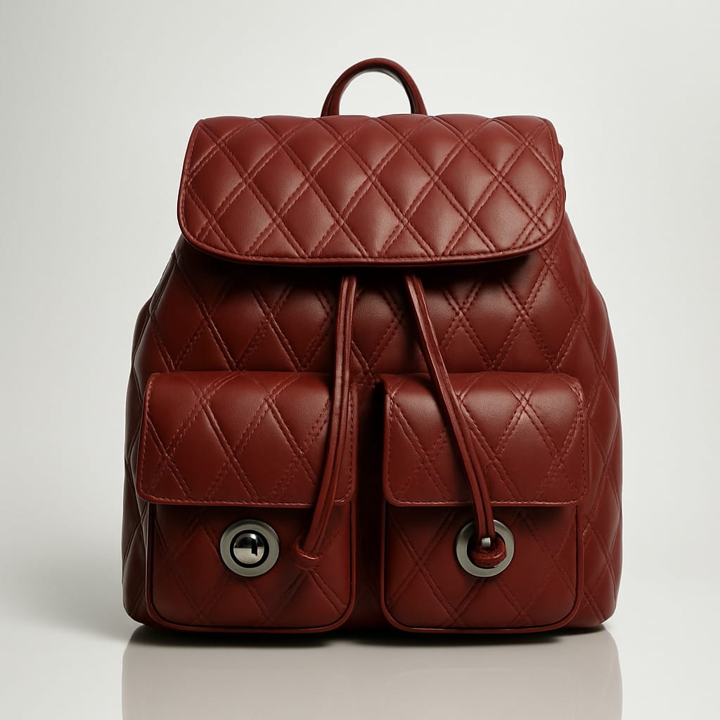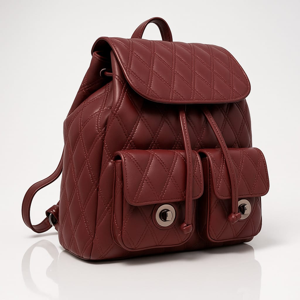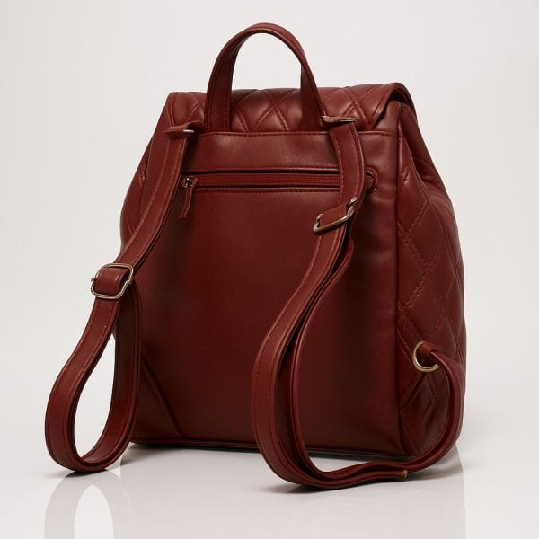 Предната част е красиво капитонирана с ромбоиден релеф и допълнена от две предни джобчета с капак и метални закопчалки, в които лесно се побират дребни вещи. Отзад има практичен джоб с цип за по-сигурно съхранение, а отгоре – къса дръжка за удобно носене в ръка. Регулируемите презрамки позволяват раницата да се нагласи според ръста и стила ви.