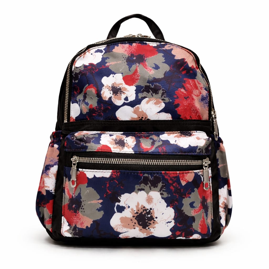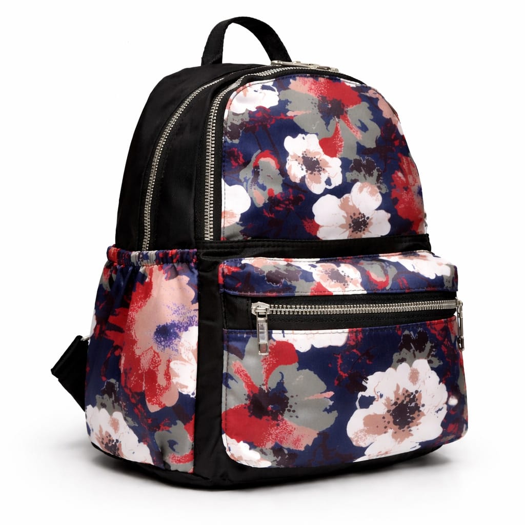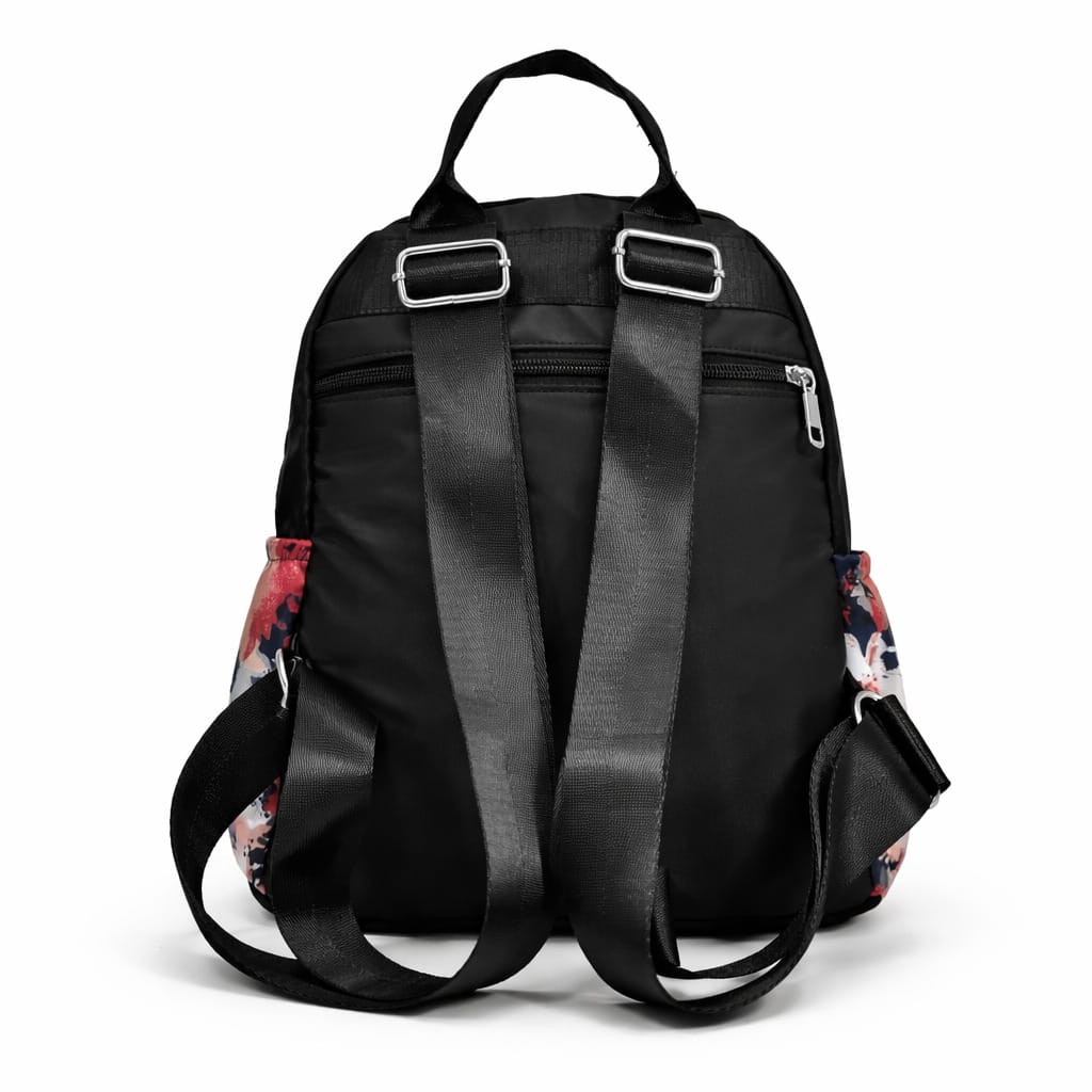 Тази дамска раница от промазка е чудесен избор за ежедневието, когато търсиш удобство, лекота и свеж акцент във визията. Изработена е от промазка и впечатлява с практичен силует, който стои добре както в градска среда, така и при по-активно ежедневие. Флоралният многоцветен десен в предната част и страничните панели внася характер, а черната основа балансира модела и го прави лесен за съчетаване.