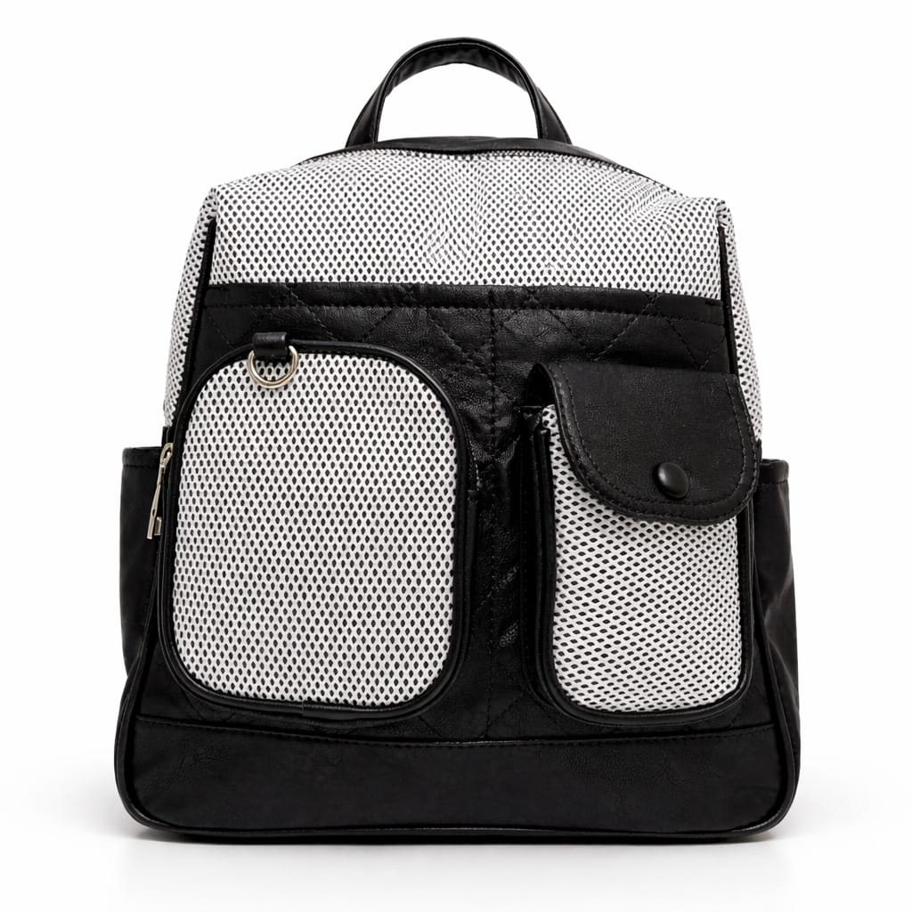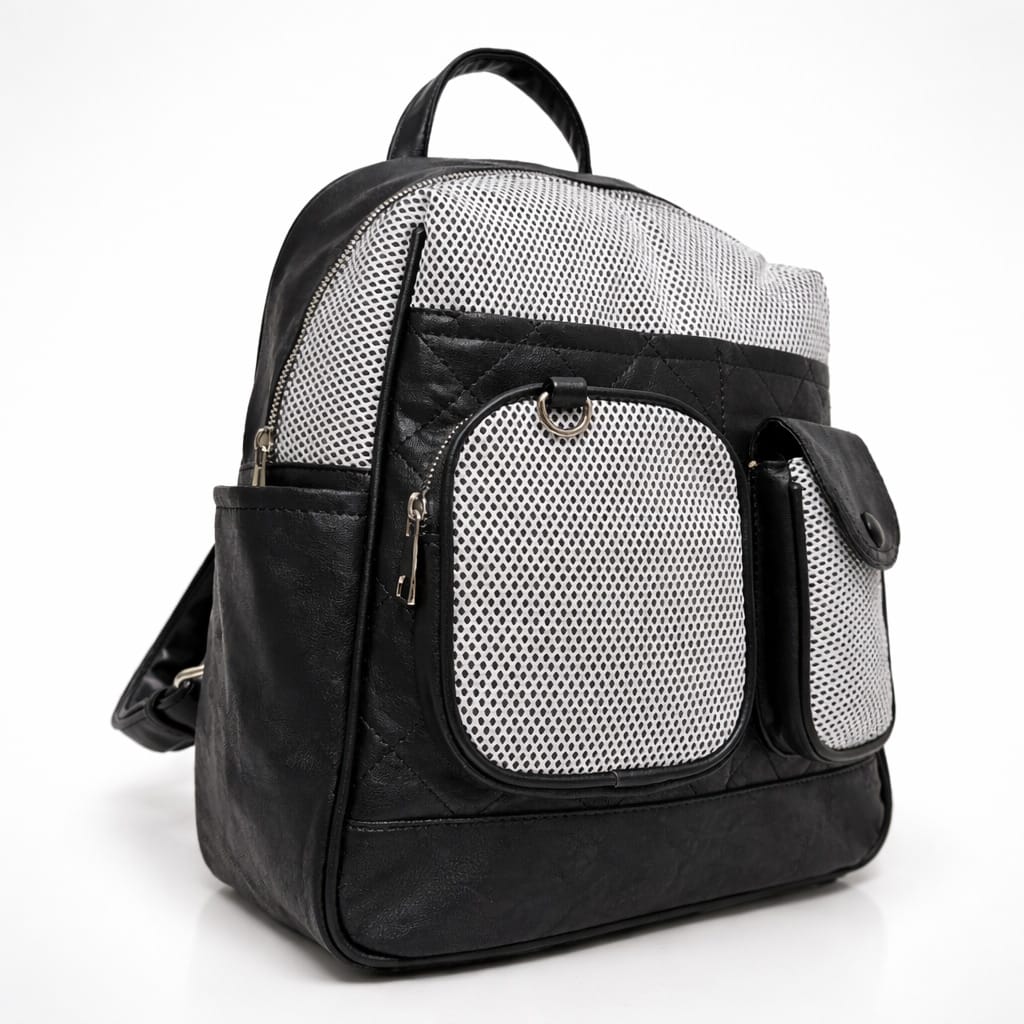 Дамска раница с мрежести джобове-идеалният избор за модерна визия и удобство в ежедневието. Компактният ѝ размер я прави перфектна за разходки, пазар или пътуване. Дизайнът с външни джобове и мрежести панели добавя свеж и спортно-елегантен акцент. Изработена е от мека материя в универсален черен цвят, която лесно се комбинира с различни аутфити.