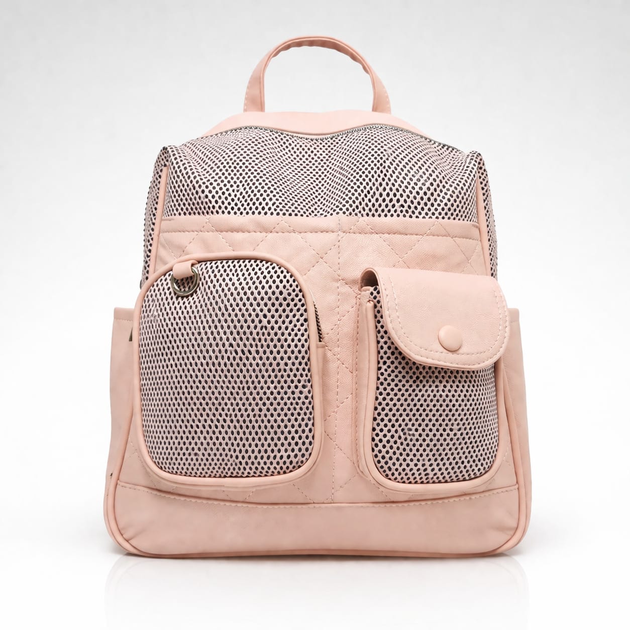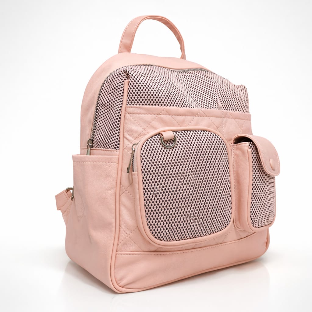 Дамска раница с мрежести джобове-идеалният избор за модерна визия и удобство в ежедневието. Компактният ѝ размер я прави перфектна за разходки, пазар или пътуване. Дизайнът с външни джобове и мрежести панели добавя свеж и спортно-елегантен акцент. Изработена е от мека материя в нежен розов цвят, която лесно се комбинира с различни аутфити.