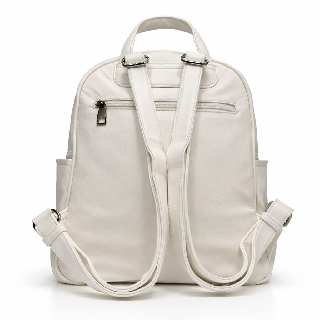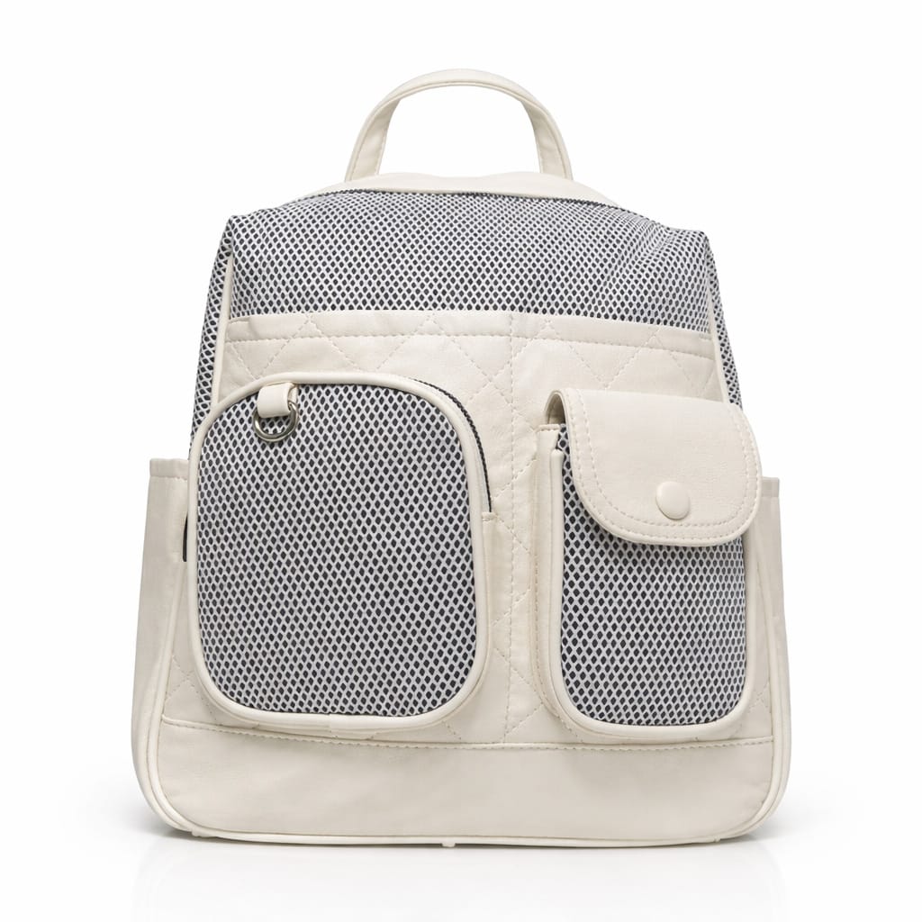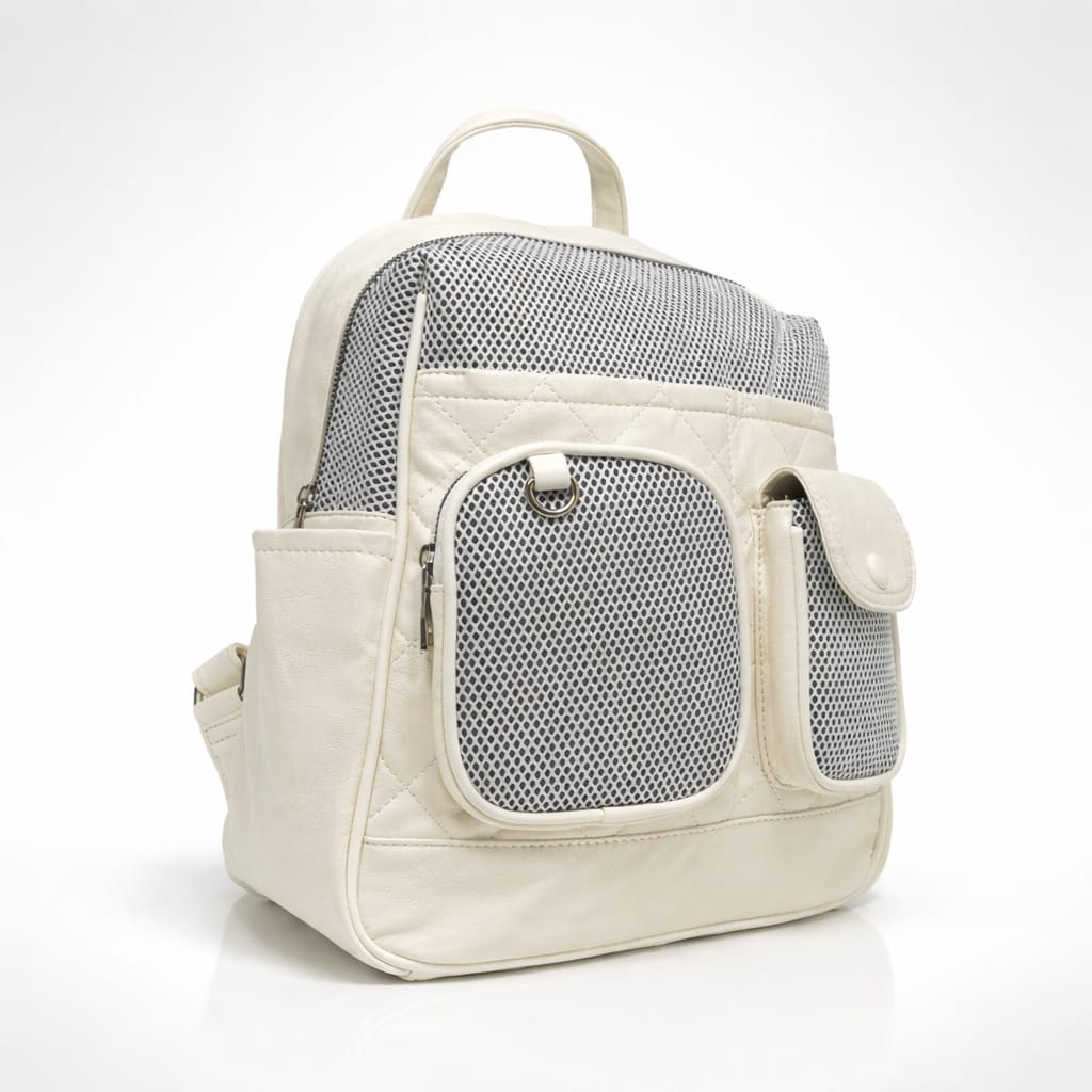 Дамска раница с мрежести джобове-идеалният избор за модерна визия и удобство в ежедневието. Компактният ѝ размер я прави перфектна за разходки, пазар или пътуване. Дизайнът с външни джобове и мрежести панели добавя свеж и спортно-елегантен акцент. Изработена е от мека материя в нежен кремав цвят, която лесно се комбинира с различни аутфити.