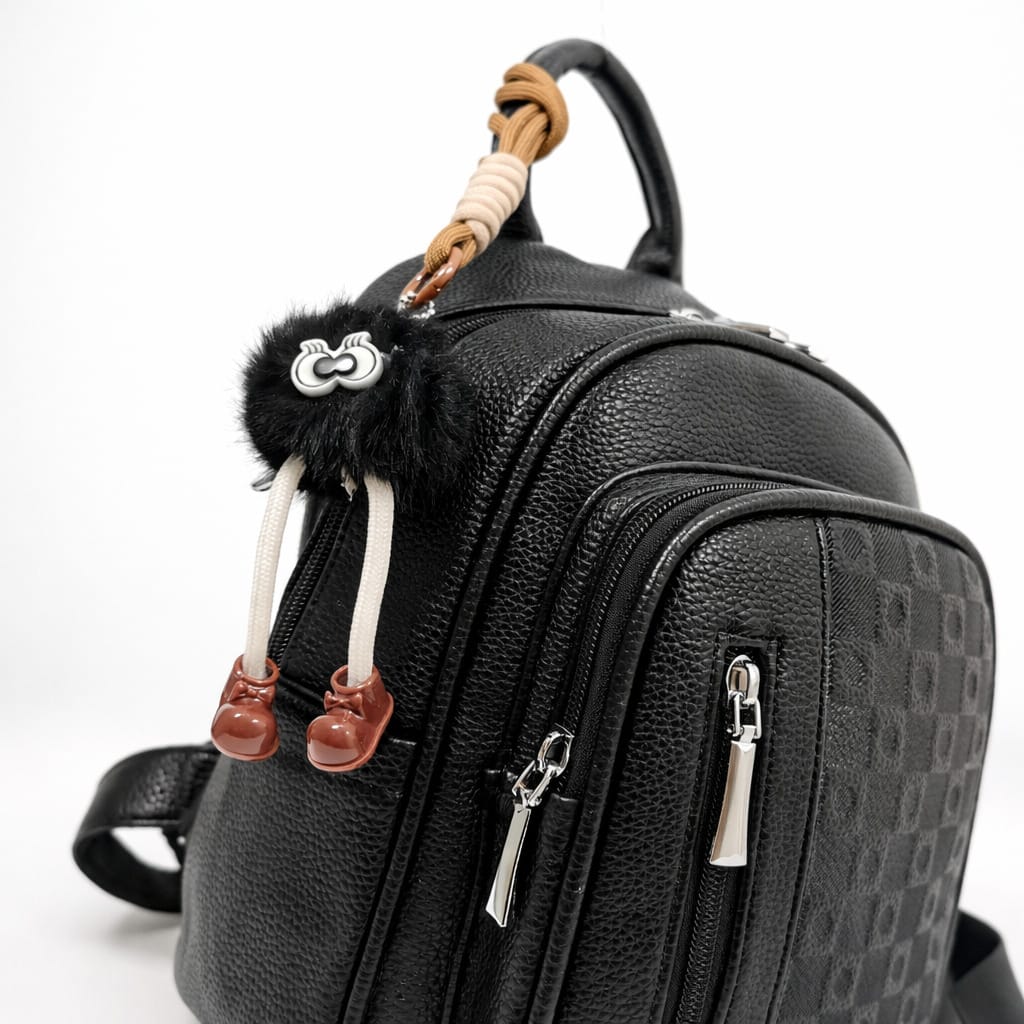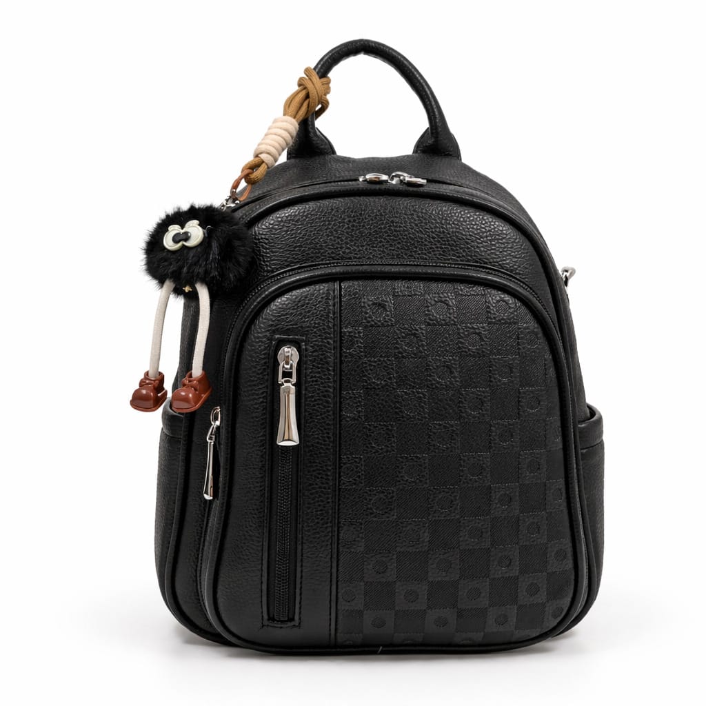 От снимките ясно личат детайли, които я отличават — изчистена овална линия, релефна предна част с шахматен ефект, вертикален преден джоб с метален цип, странични джобове и ефектен декоративен аксесоар към късата дръжка. Сребристите метални елементи добавят свеж контраст и подчертават модерното излъчване на модела. Вътрешната част е с хастар полиестер, което допълва практичния характер на раницата. Това е модел с характер, създаден за жени, които харесват подредената визия, но не правят компромис с удобството.