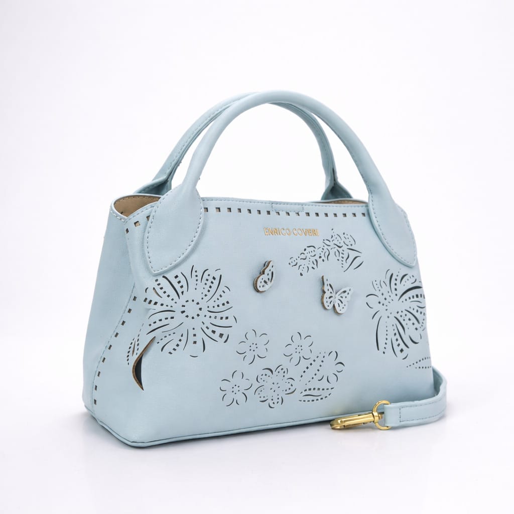 Тази дамска светло синя чанта с апликация, е стилен и практичен модел, подходящ за ежедневие, работа и разходки. Компактният, но удобен размер позволява да носите най-необходимите вещи , подредени в три отделни прегради като средната е с цип, а двете странични се закопчават с магнитни копчета. Чантата разполага с къси дръжки за носене в ръка и дълга регулируема дръжка за носене през рамо. Декоративната висулка придава модерен и завършен вид, а изчистеният дизайн я прави лесна за съчетаване с различни стилове.