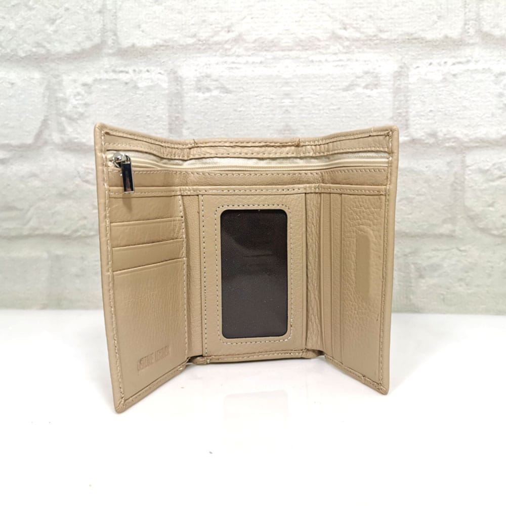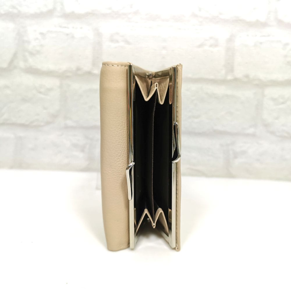 Портмонето се затваря със скрити магнити, монетника с метална рамка, а една от преградите за банкноти с цип