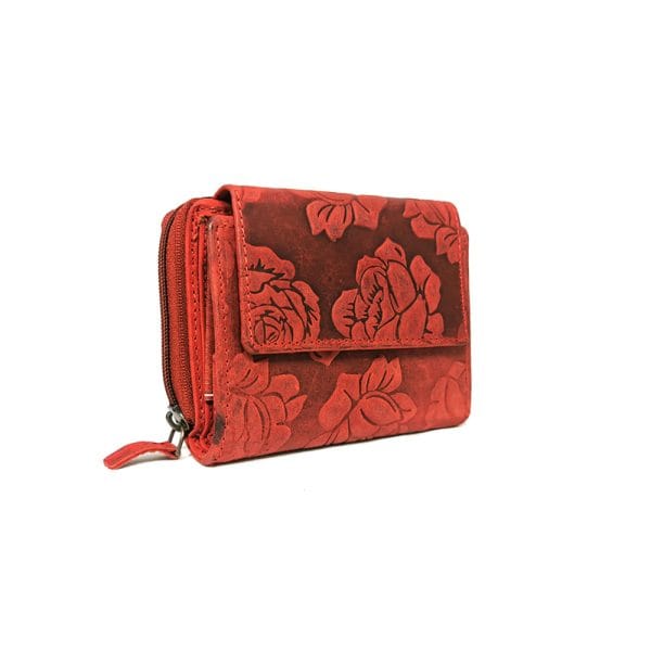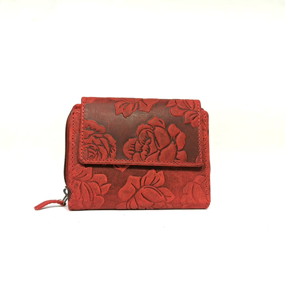 Компактно и елегантно дамско портмоне от естествена кожа в цвят бордо, с релефен флорален мотив и удобен външен джоб с цип за монети. Практичният дизайн с капак и отделения за карти го прави идеален за ежедневна употреба.