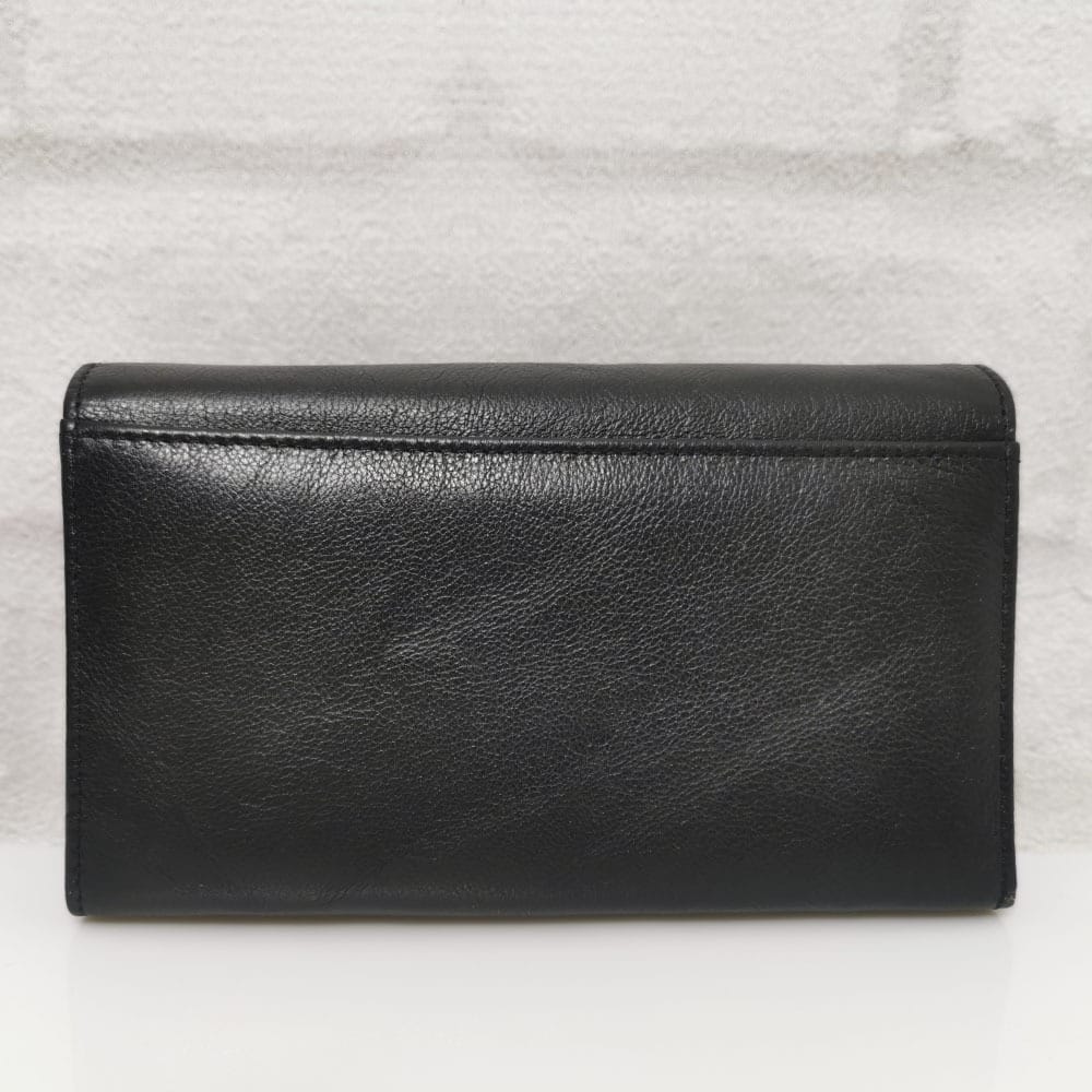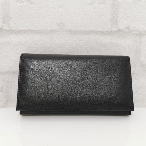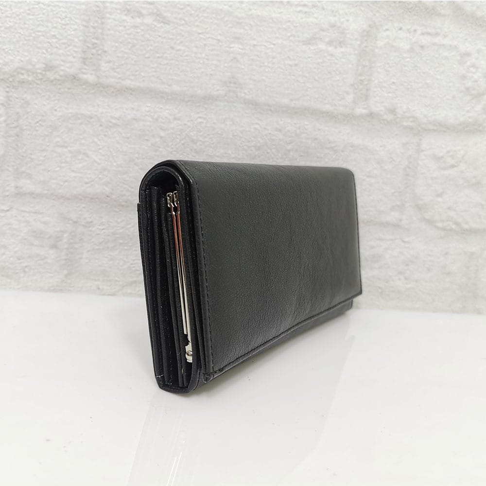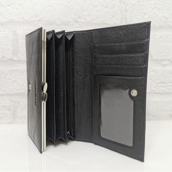 Отвън на гърба джоб, отвътре-четири големи прегради за банкноти , монетник с метална рамка, в който има средна преграда, 3 отделения за визитки, 1 голем прозрачен джоб за карта