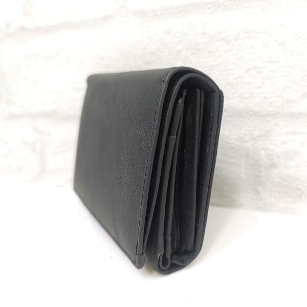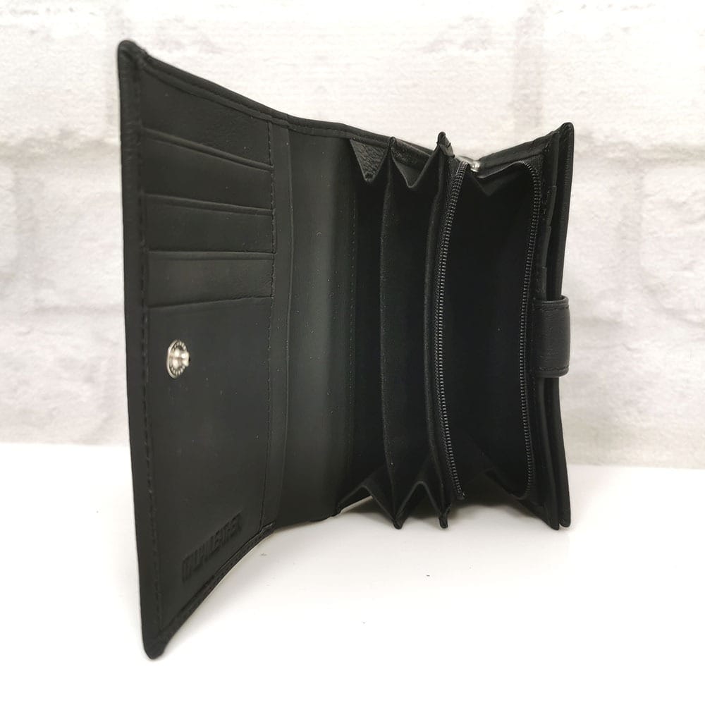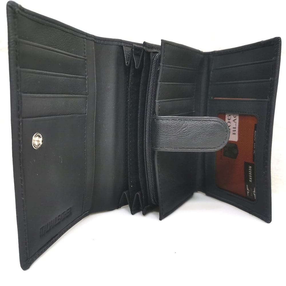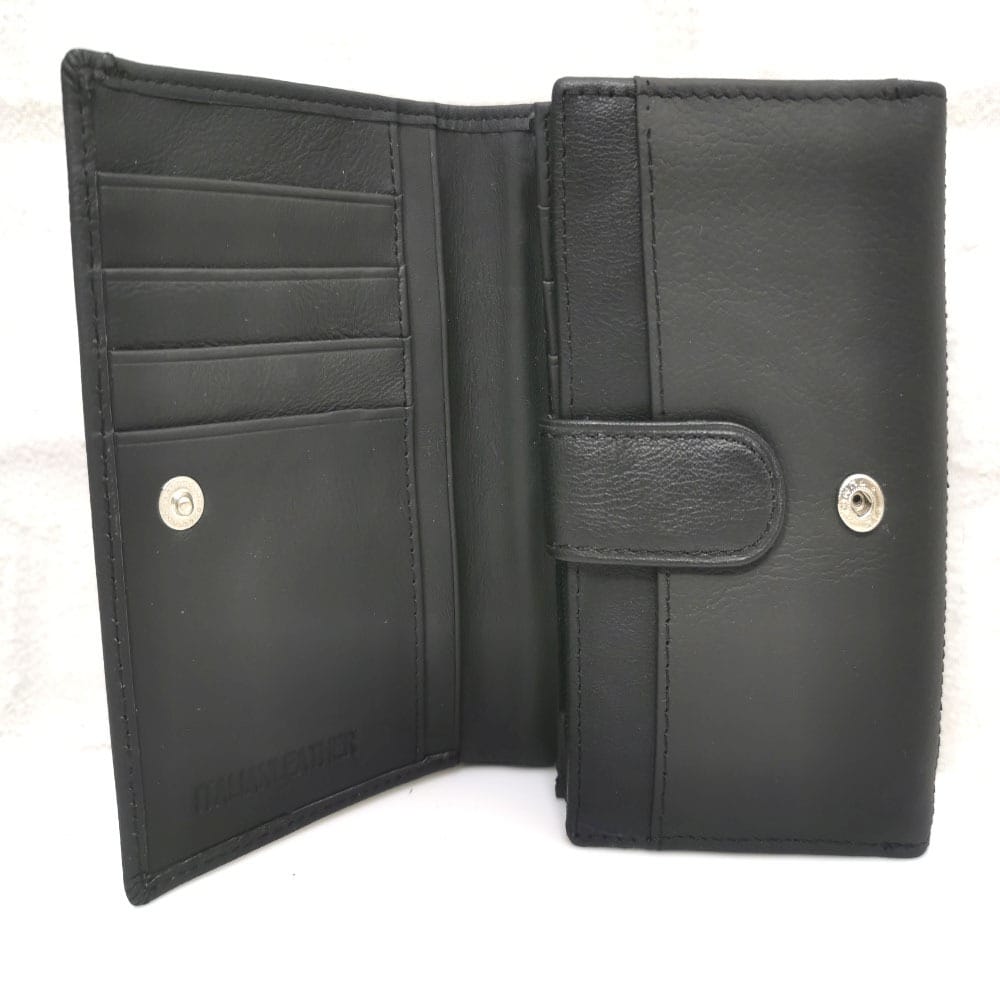 Едно отделение за банкноти, 18 процепа за карти с различна големина, 1 от които е прозрачно, монетник с цип