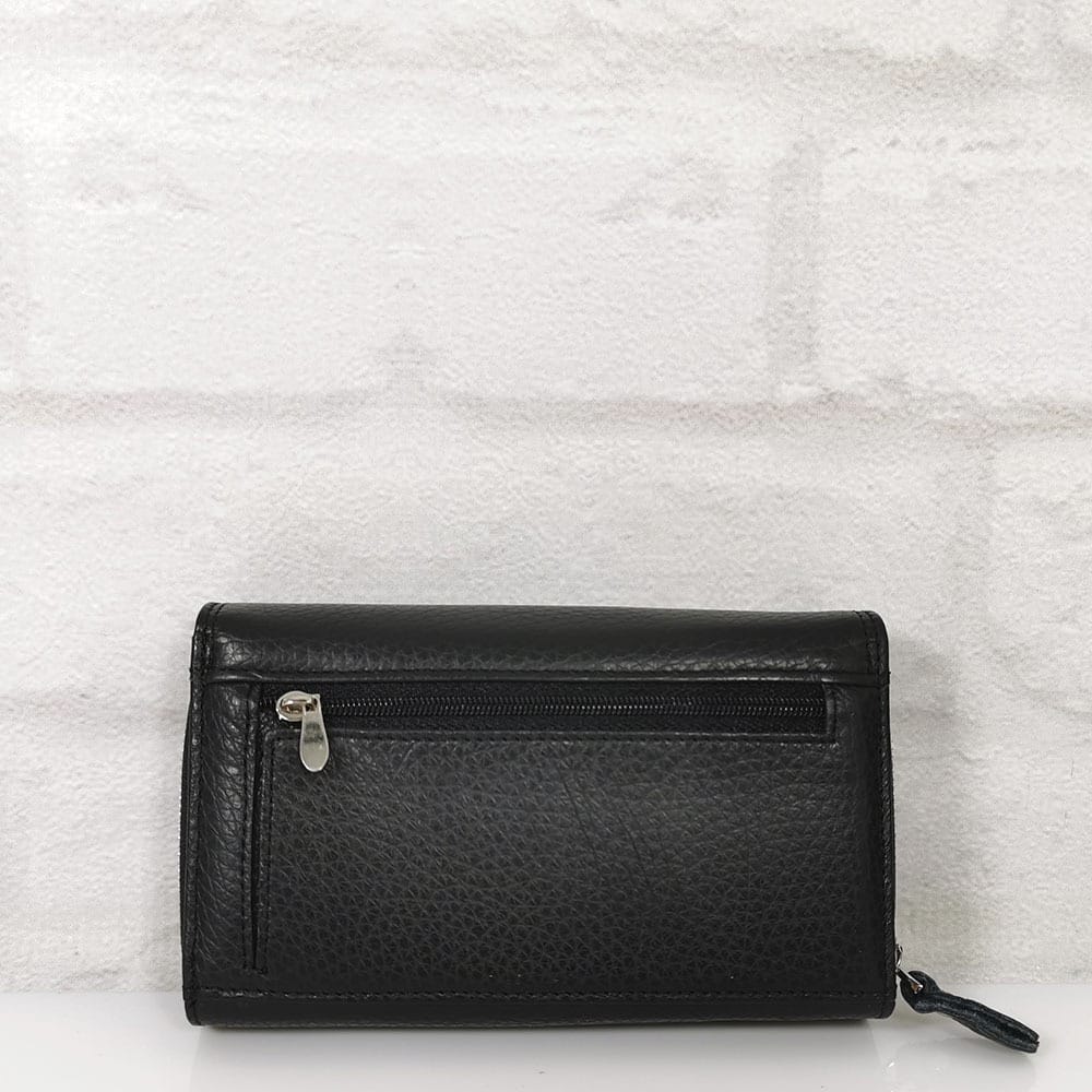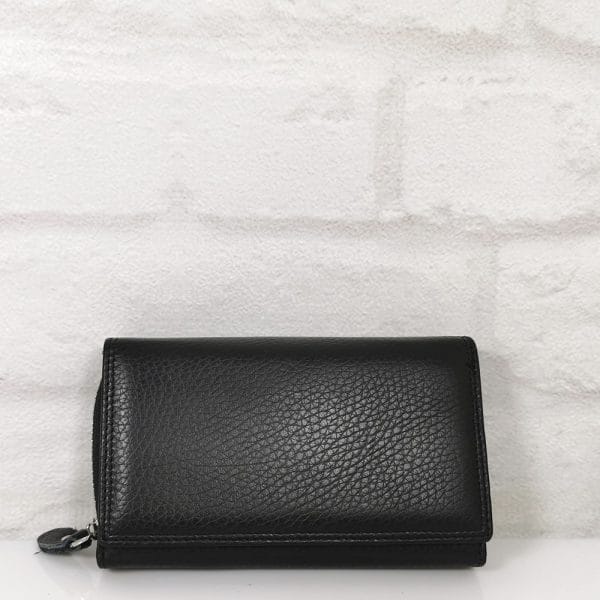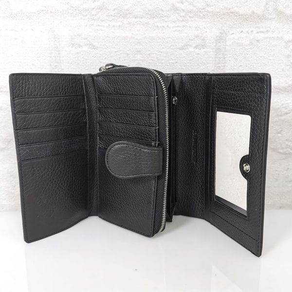 По вертикала една голяма преграда за банкноти, по хоризонтала 6 прегради, едната с цип, голям монетник с преграда с метален цип, падащ борд закопчан с копче тик-так и в него има две големи прегради и 10 малки отделения за карти или визитки, отвън на гърба джоб с цип
