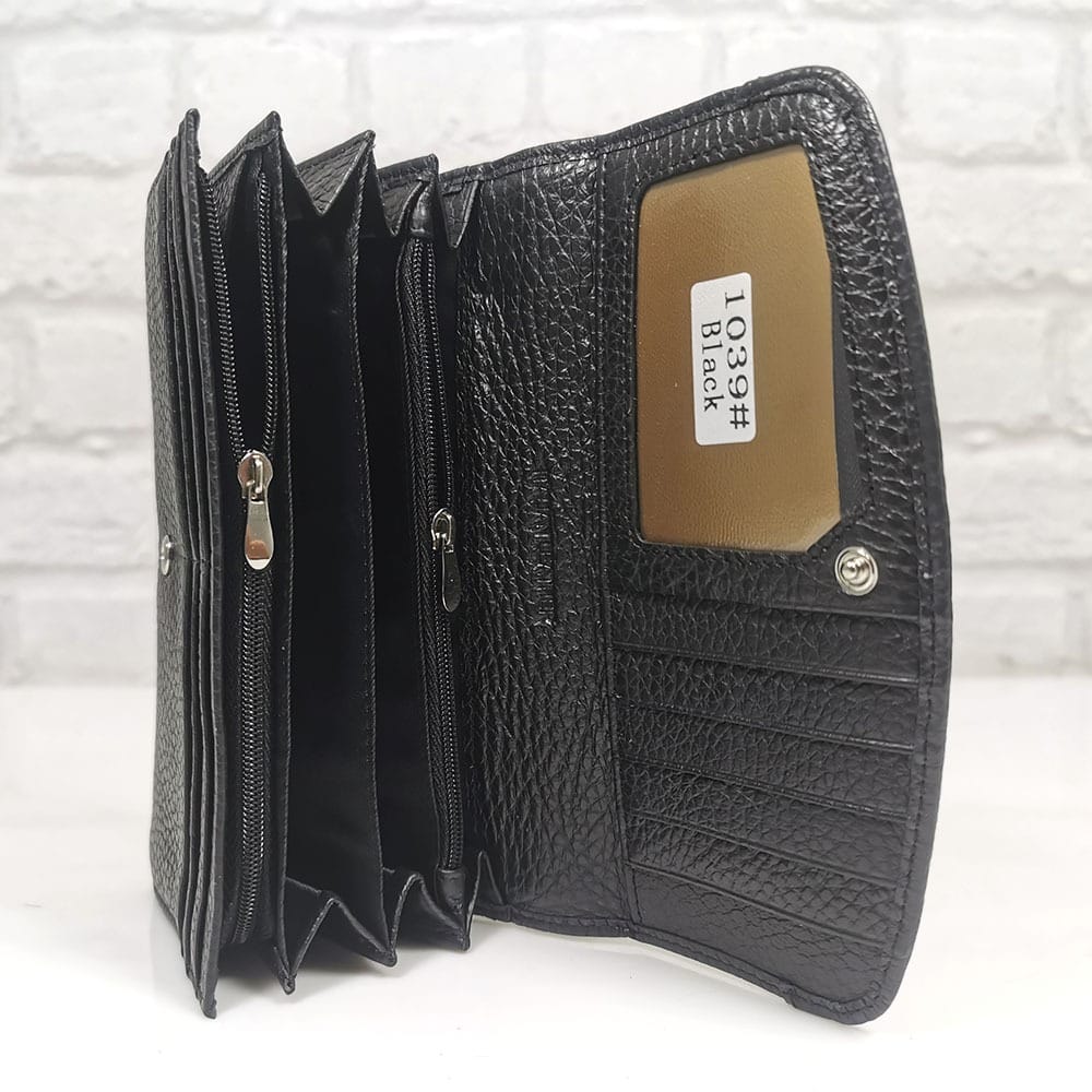Отвън на гърба джоб, отвътре-шест големи прегради за банкноти, като двете са с цип и стават за монети, 12 отделения за визитки, като едното е прозрачно