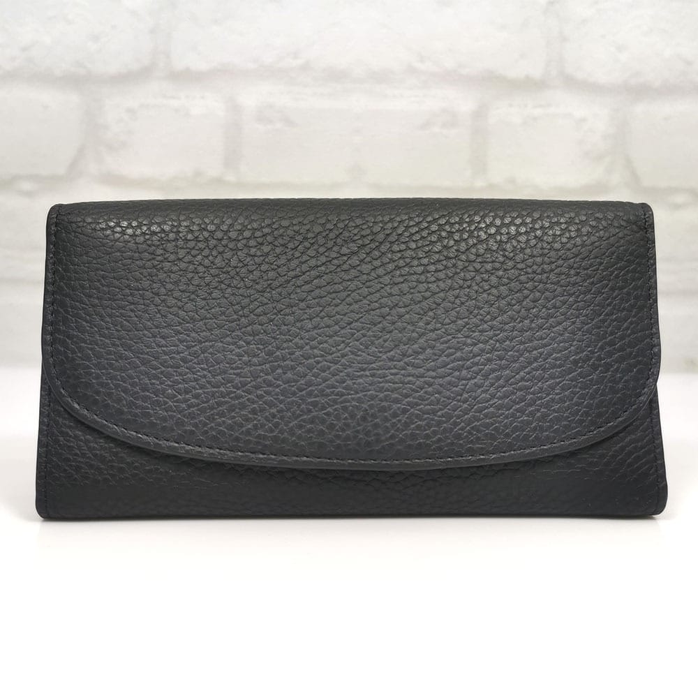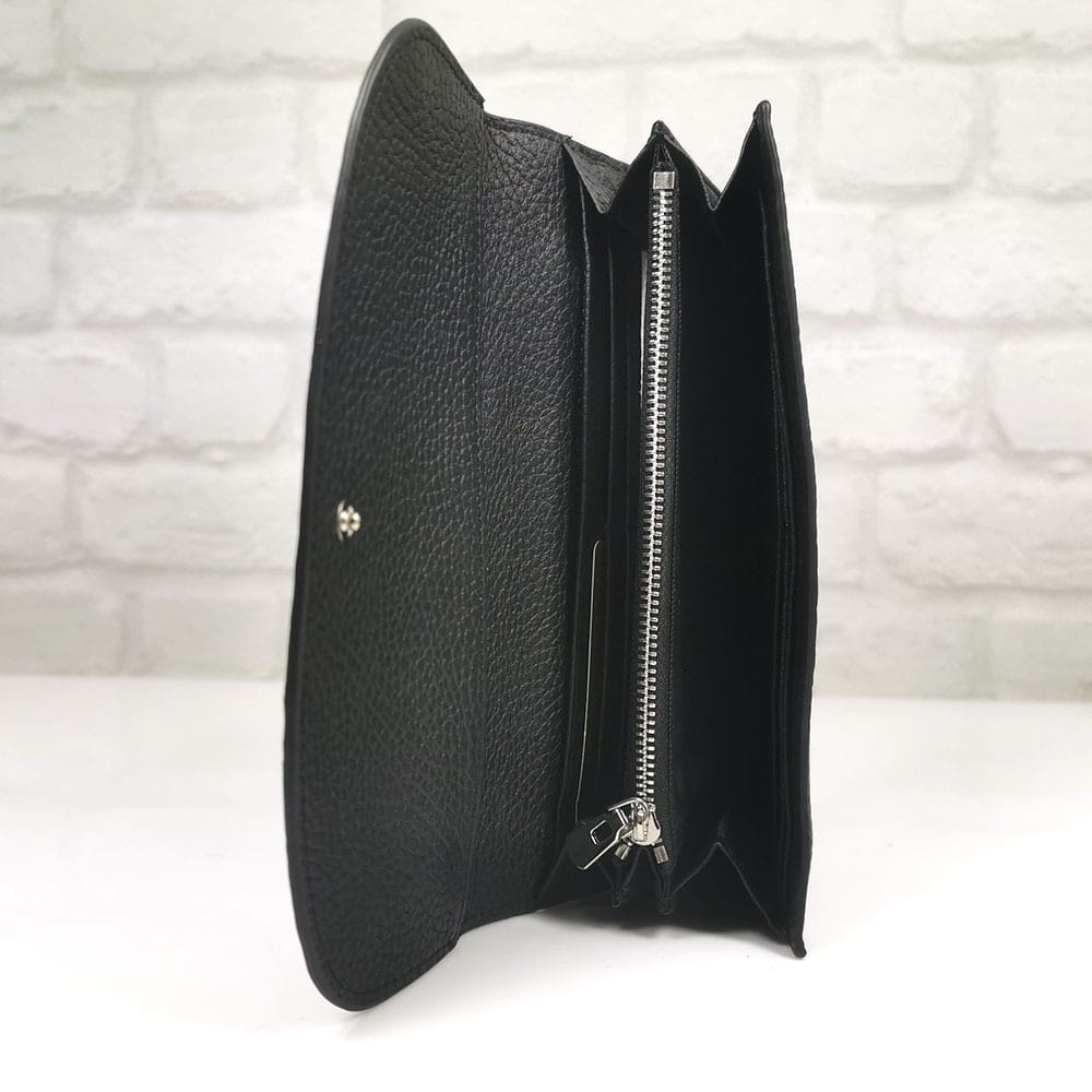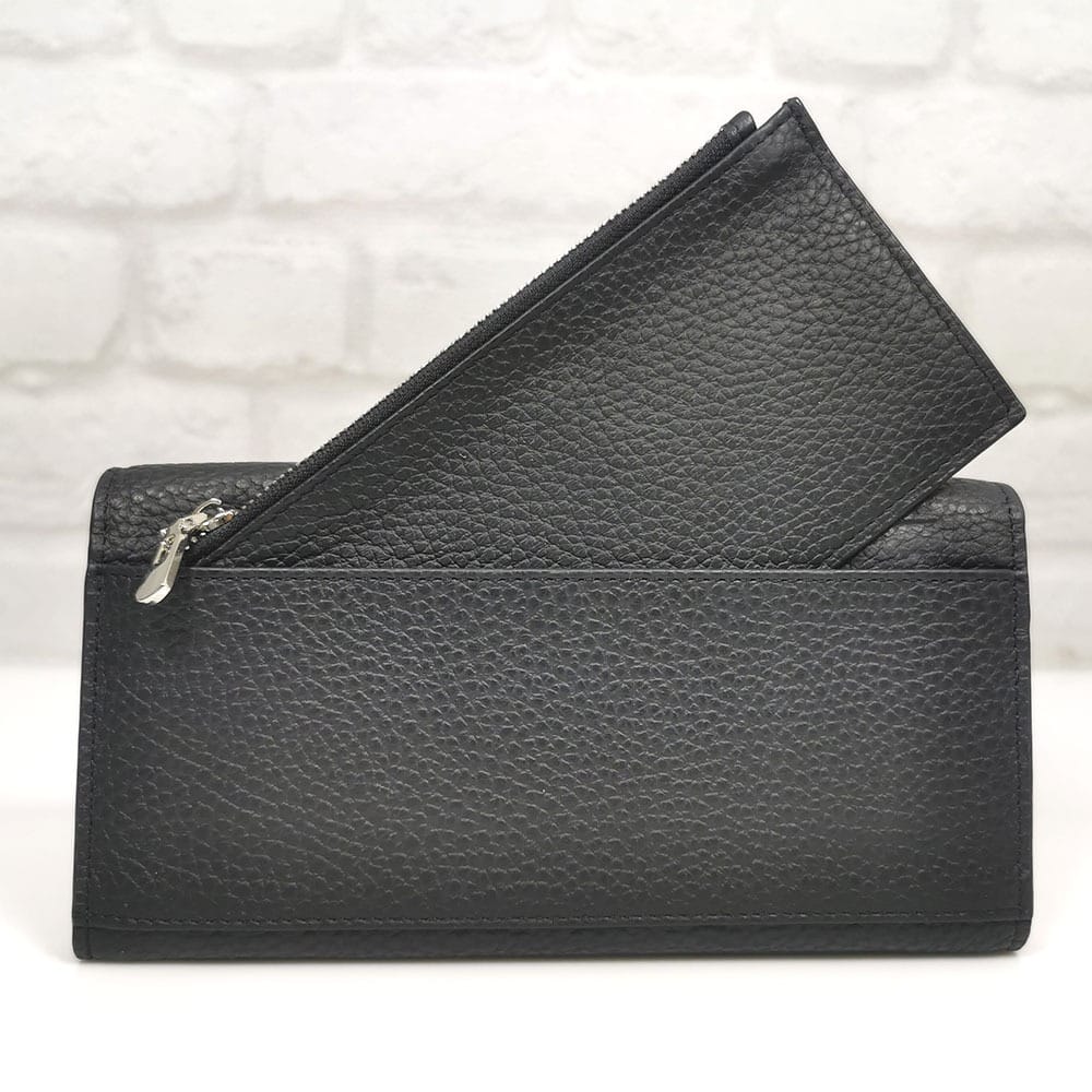 Четири големи прегради за банкноти , вътрешен монетник с цип, подвижен монетник с цип, 10 отделения за визитки, отвън на гърба има преграда