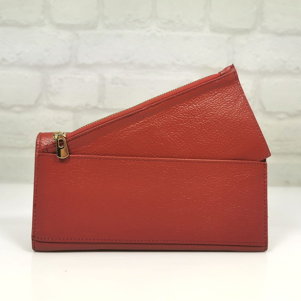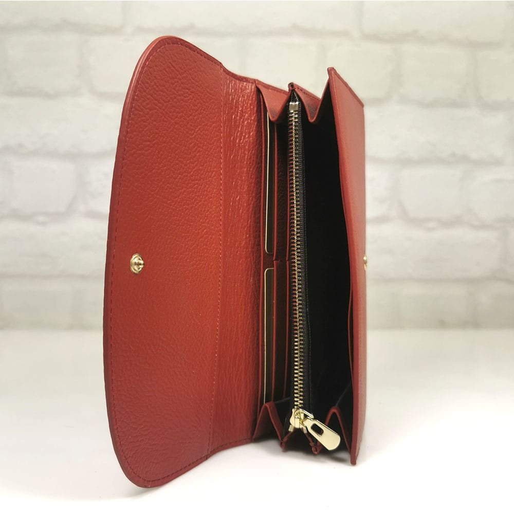 Четири големи прегради за банкноти , вътрешен монетник с цип, подвижен монетник с цип, 10 отделения за визитки, отвън на гърба има преграда