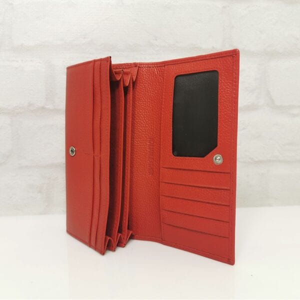 Три отделни прегради-една с цип и вътре преграда; втората с метална рамка; третата с капак с копче тик-так. В преградата с капак има 3 отделения за банкноти и 9 отделения за визитки, като едното е прозрачно