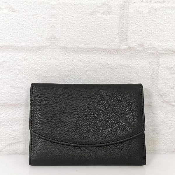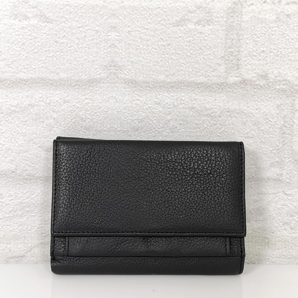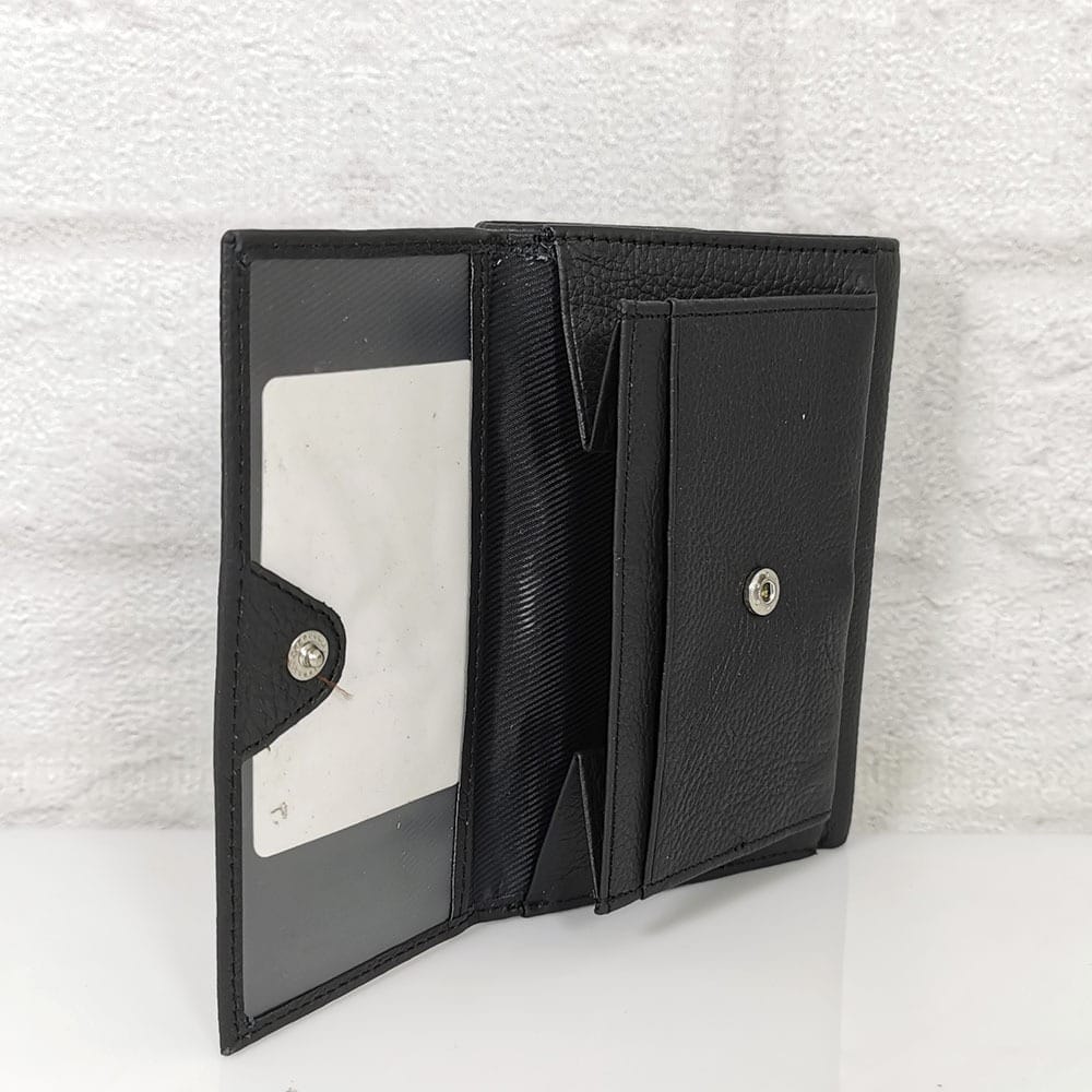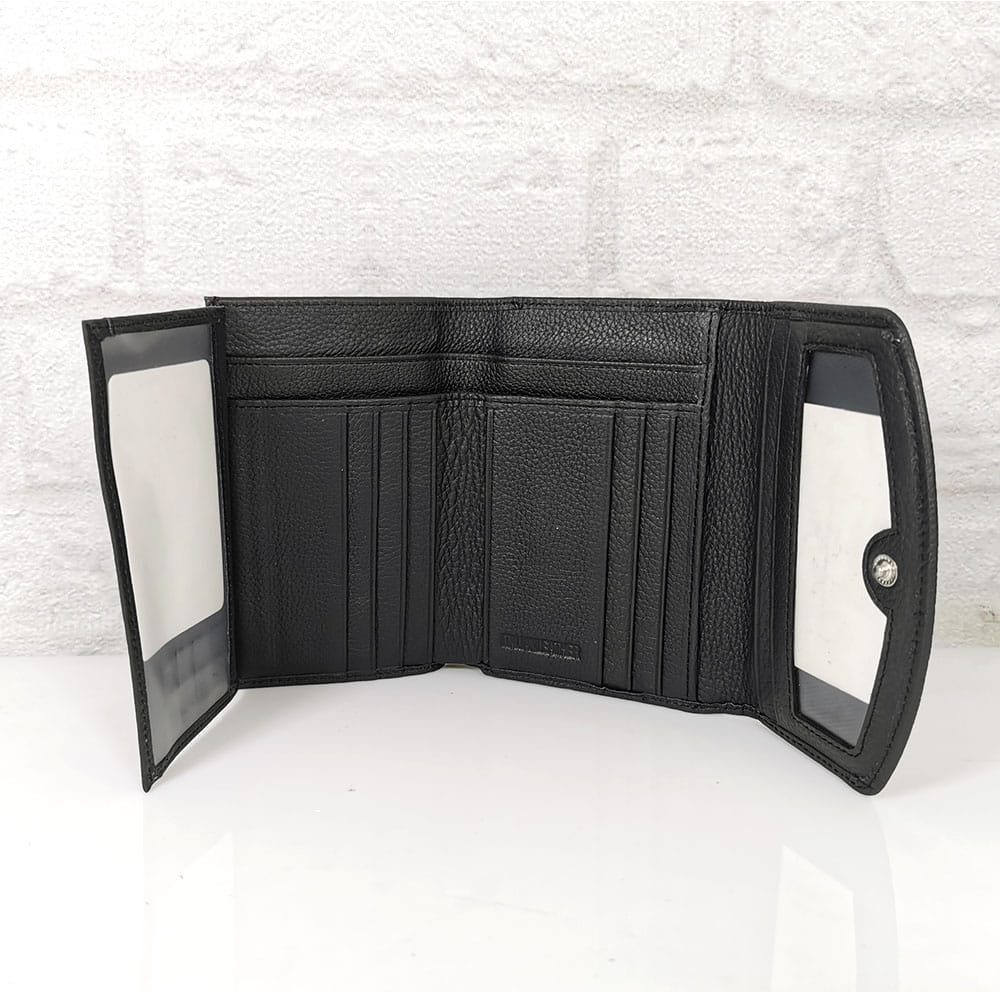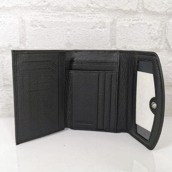Основна част: 2 отделения за банкноти, 2 прозрачни прегради, 13 малки прегради за карти; отвън на гърба монетник с един прозрачен джоб и един кожен джоб, закопчава се с копче тик-так