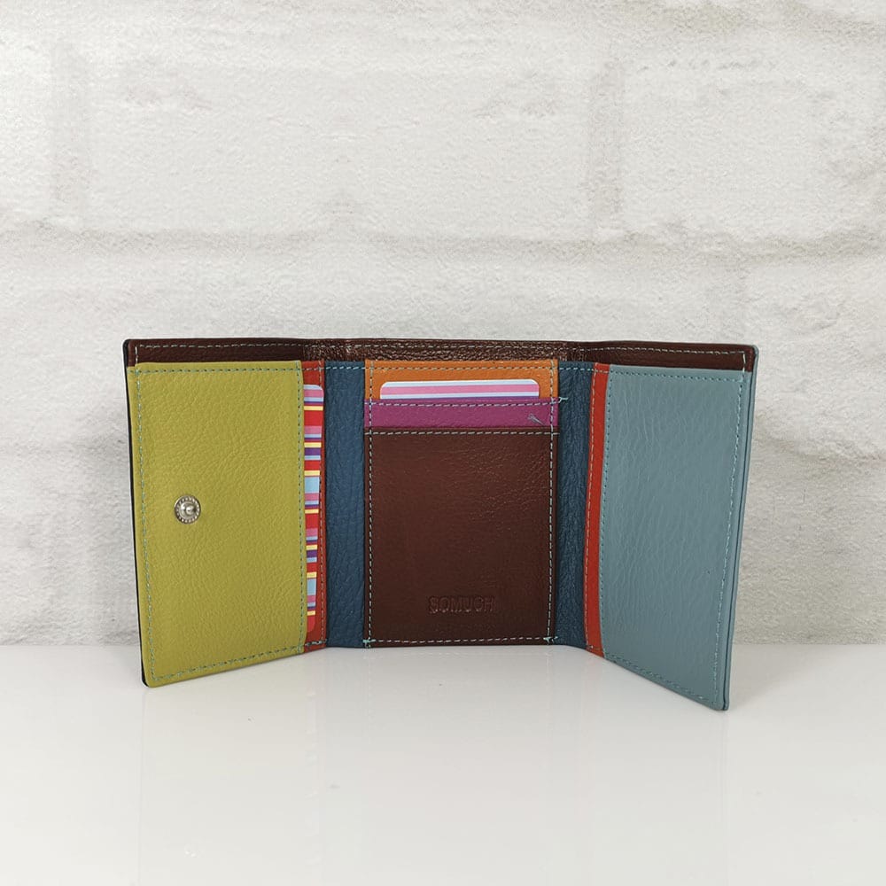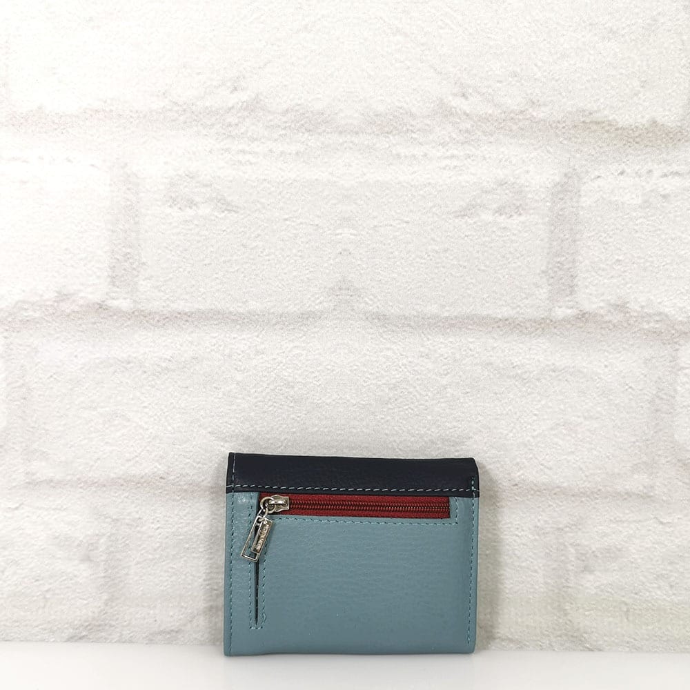 Основна част: една преграда за банкноти, 7 малки отделения за карти или визитки, на гърба джобче с цип
