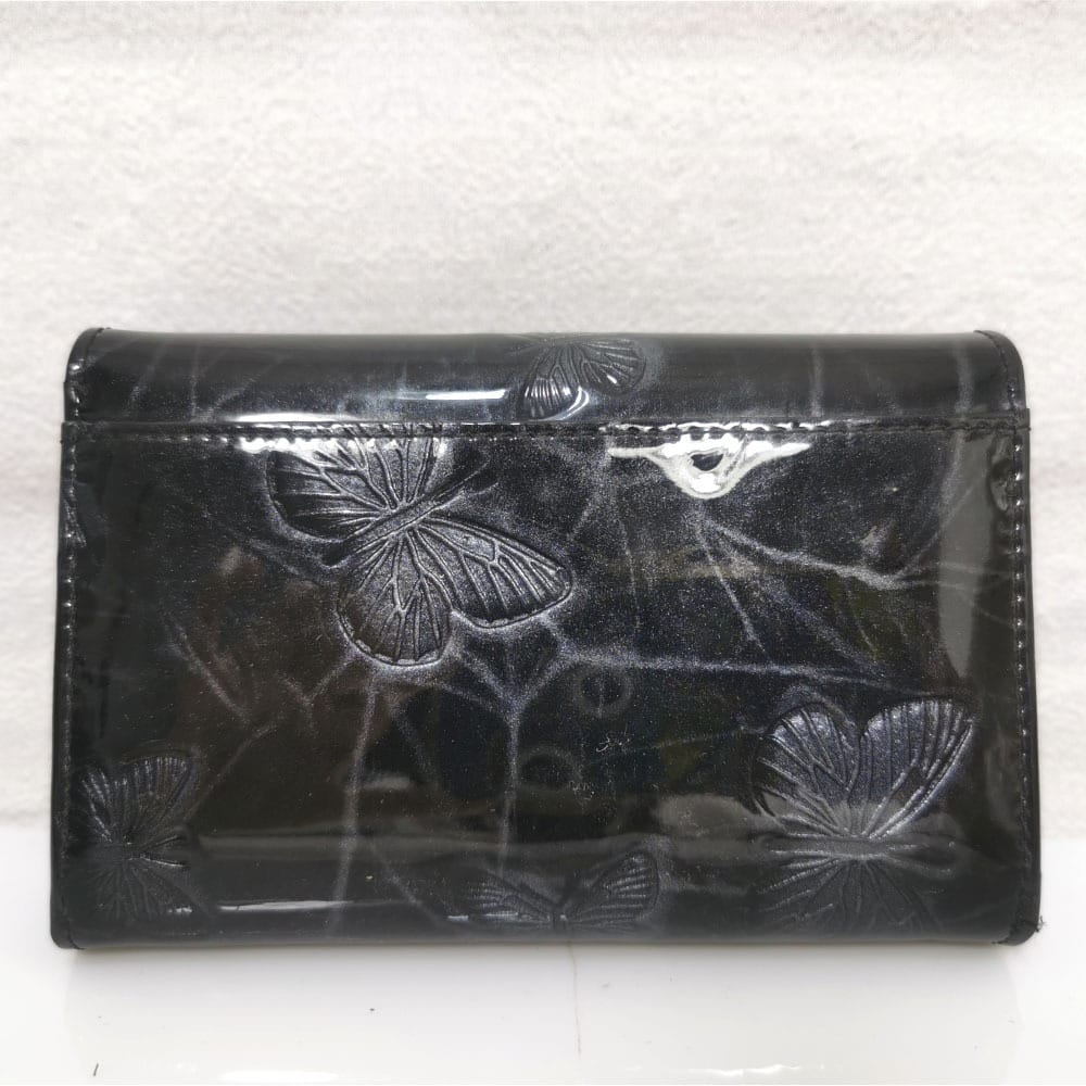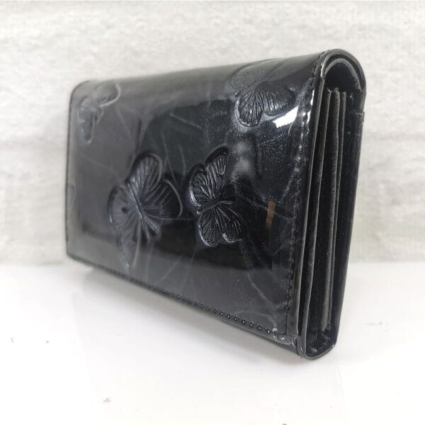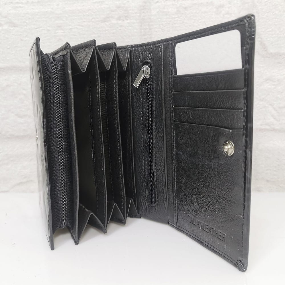 Едно голямо отделение за банкноти, 4 малки прегради, 7 процепа за карти с различна големина, малко джобче с цип, монетник с преграда и цип