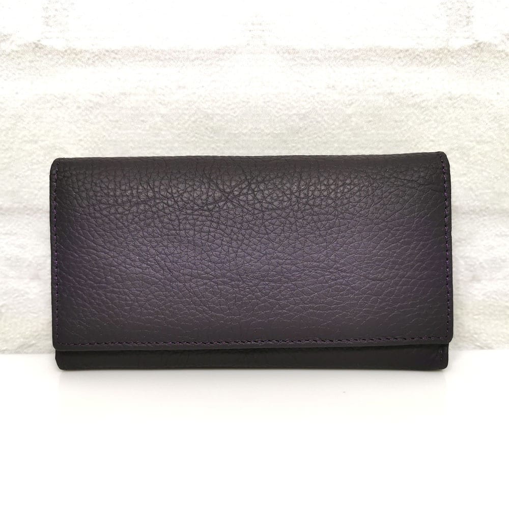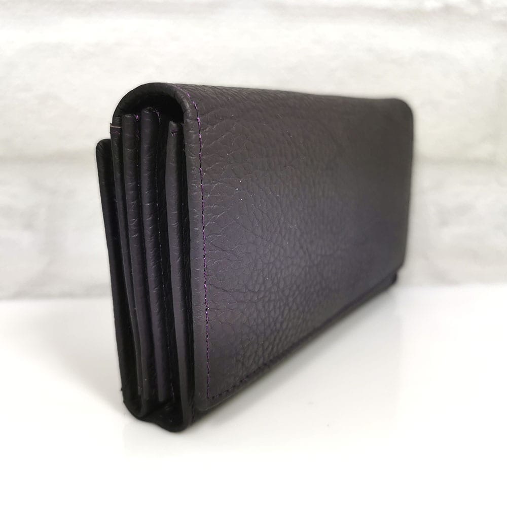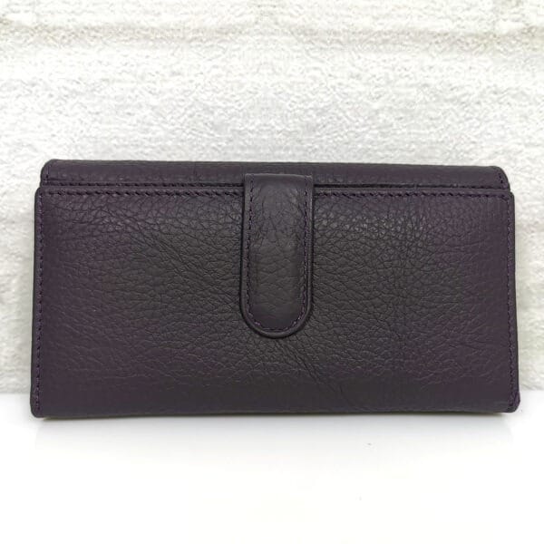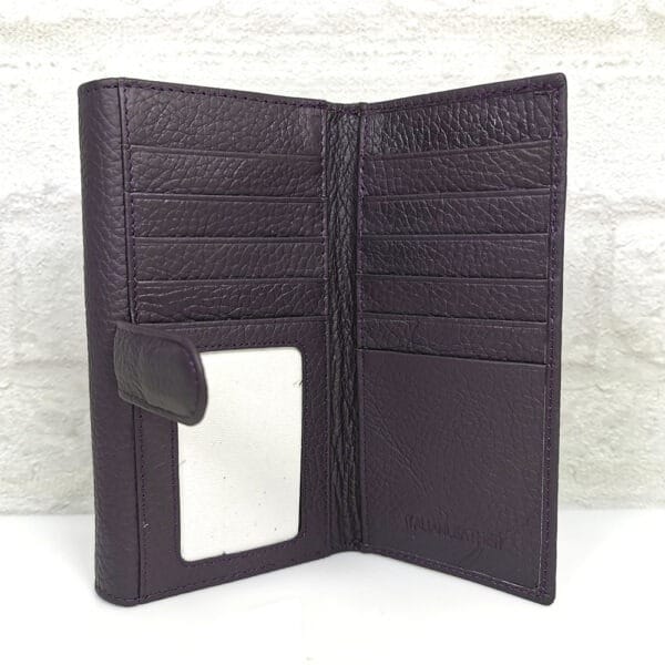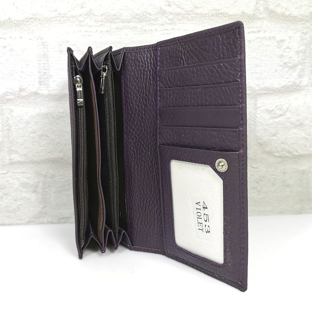 Две отделения- едното е за банкноти и монети с 6 прегради, като двете са с цип и на капака от вътрешната страна има 5 джобчета за карти, като единият е прозрачен. Второто отделение е за карти и визитки с 11 джобчета, като едното е прозрачно и един голям джоб. Затваря се с копче тик-так
