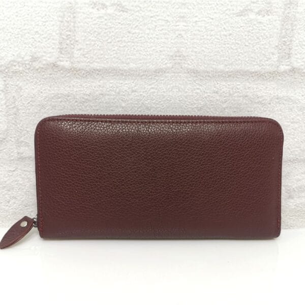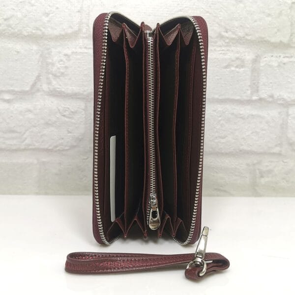 Отвън на гърба джоб с цип; отвътре 7 големи прегради, едната от които с метален цип; 12 прегради за визитки, малка дръжка за носене като чантичка