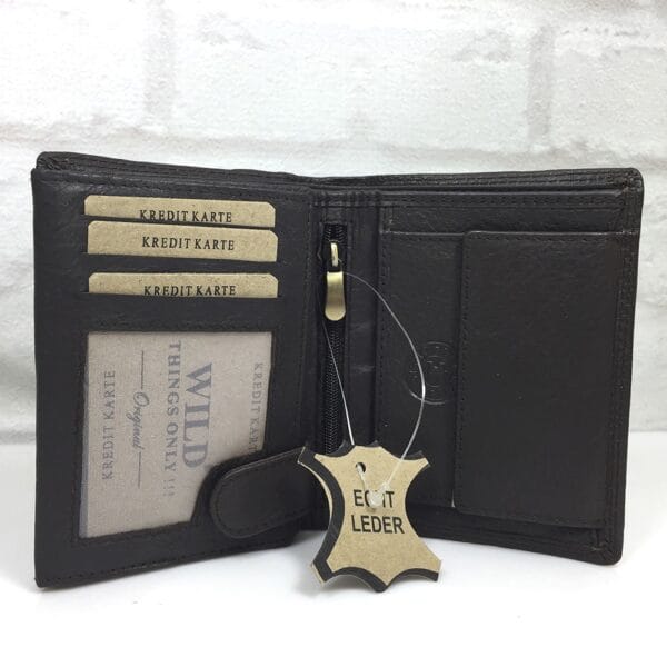 Две прегради за банкноти, монетник с копче тик-так, 11 отделения за визитки, 2 прозрачни отделения за карти, таен джоб с цип, отвън на гърба едно отделение