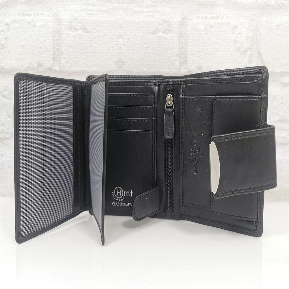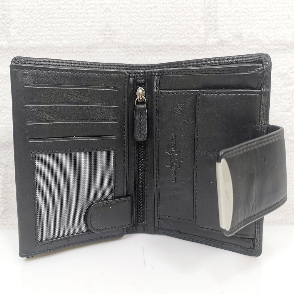 2 прегради за банкноти, 16 процепа за карти с различни големини, като 3 от тях са прозрачни, малко джобче с цип, монетник с копче тик-так