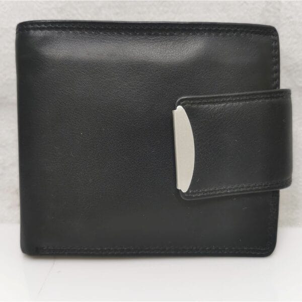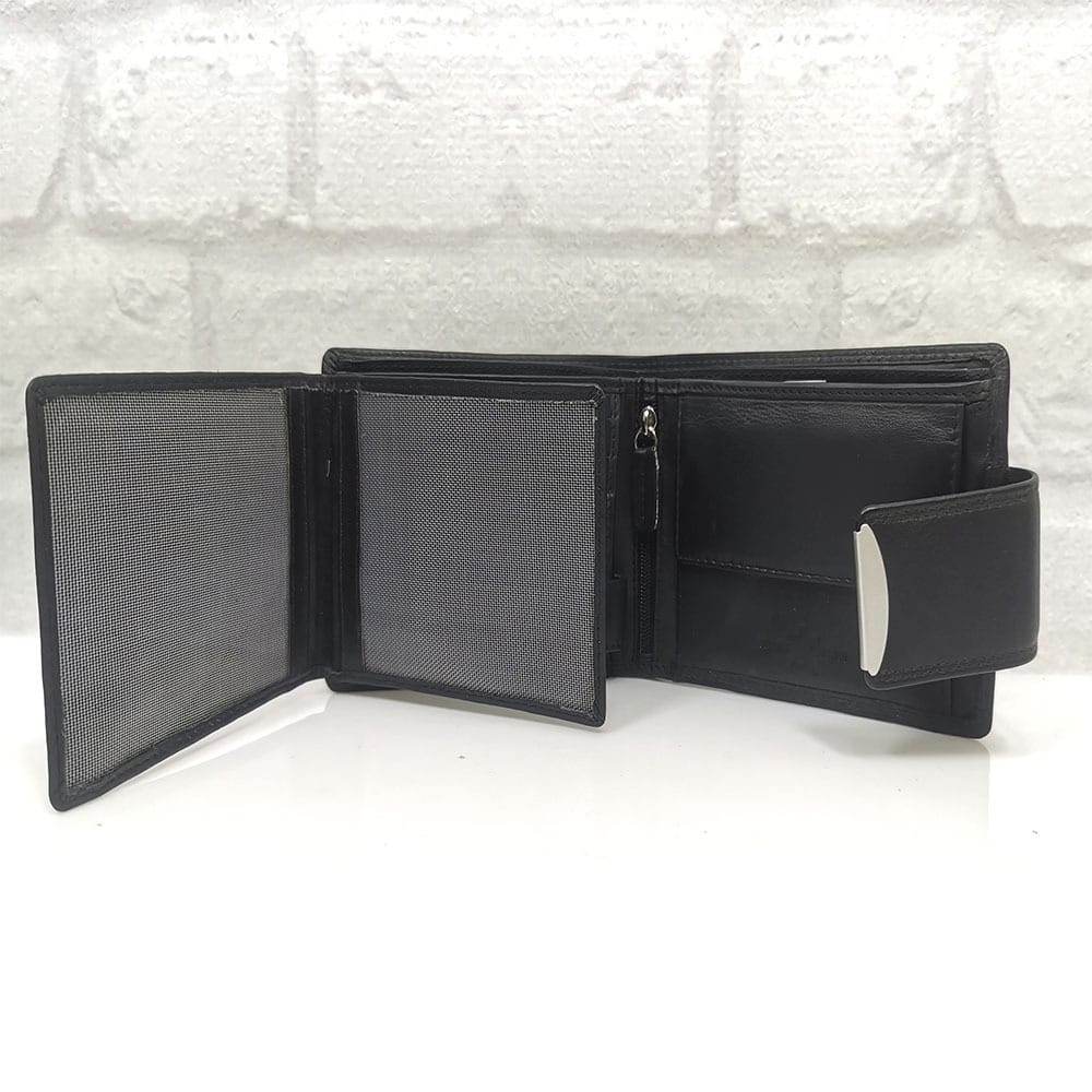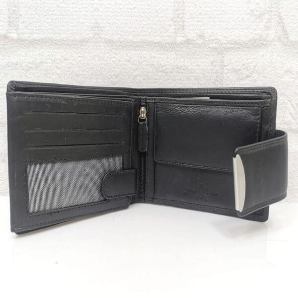 Две отделения за банкноти, 13 процепа за карти с различна големина, 3 от които са прозрачни, монетник с копче тик-так, малко джобче с цип