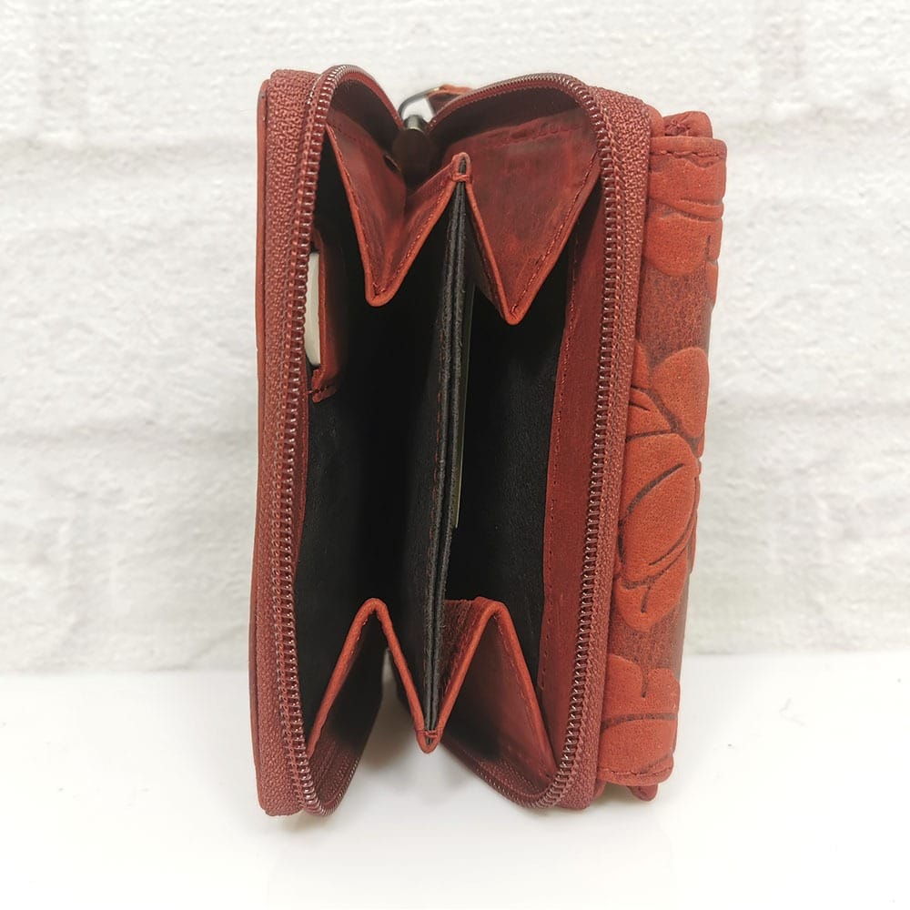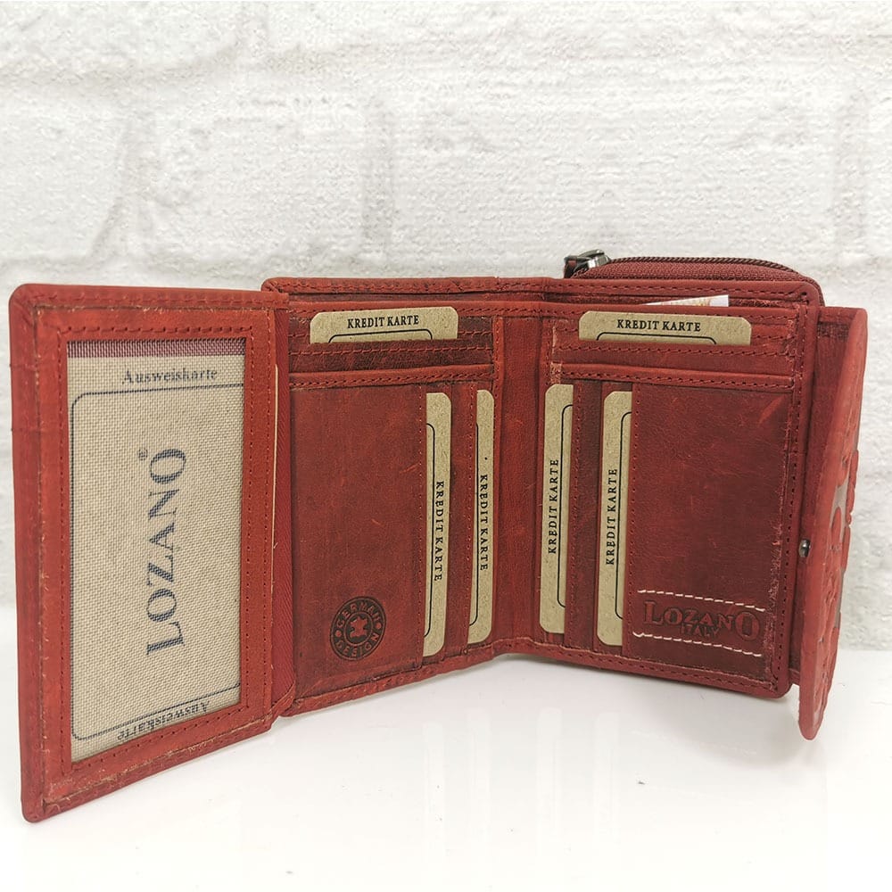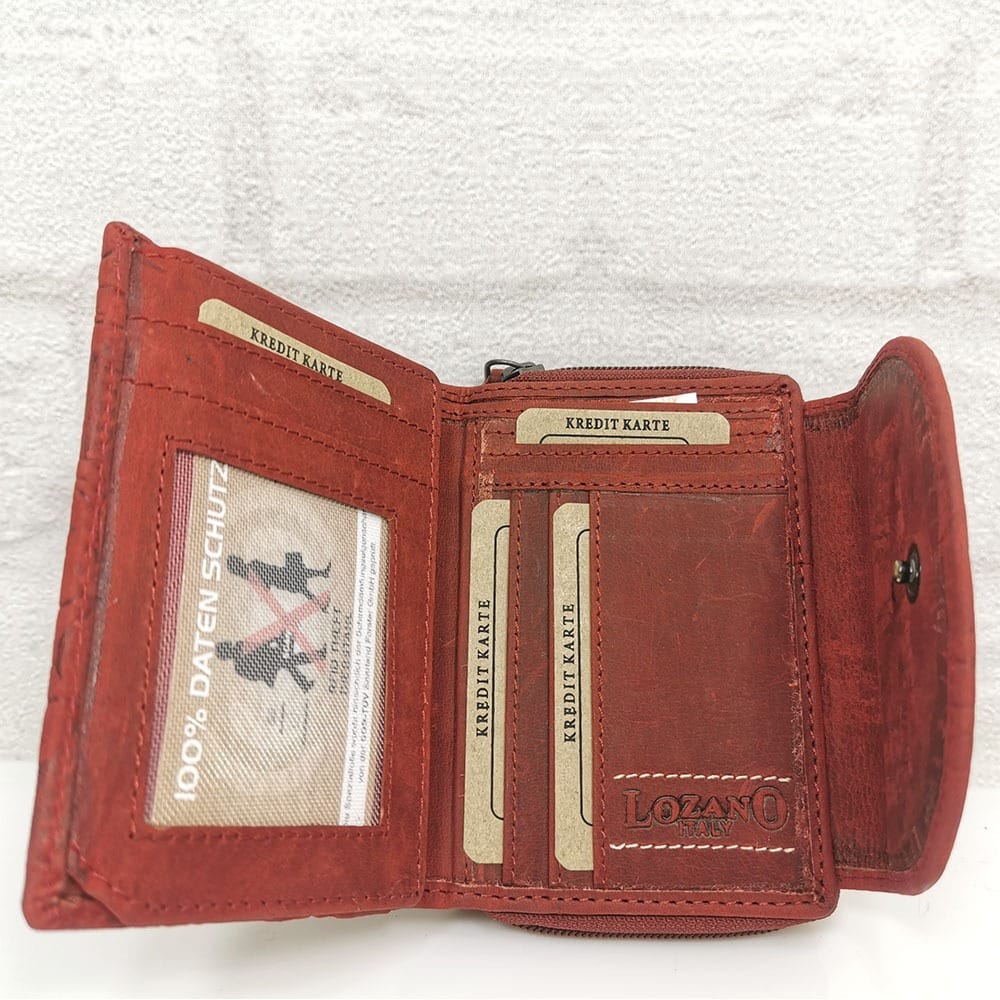 Едно отделение за банкноти, 13 процепа за карти с различна големина, 2 от които са прозрачни, голям монетник с цип в него има 3 прегради