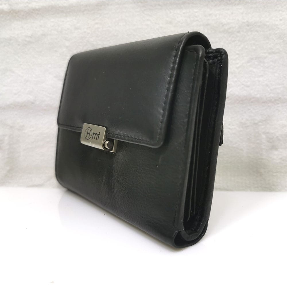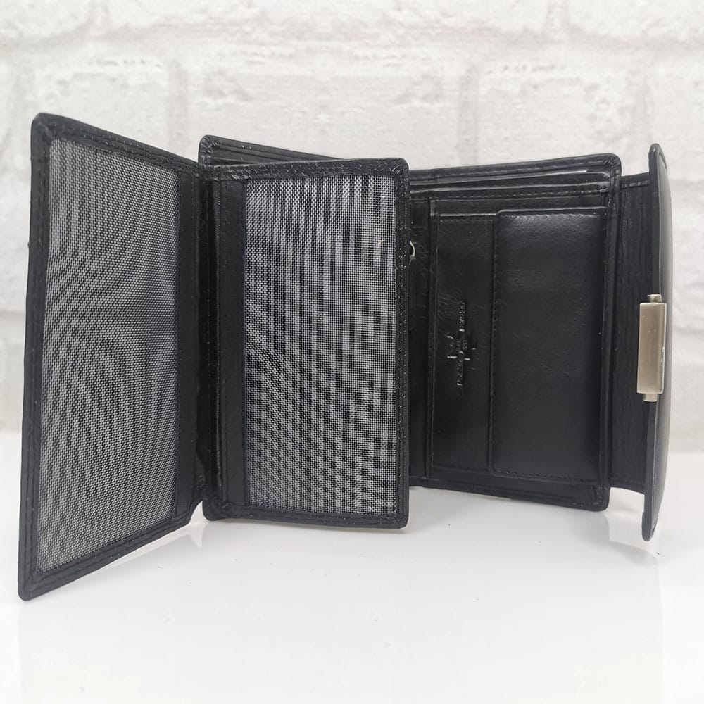 2 прегради за банкноти, 15 процепа за карти с различни големини, като 3 от тях са прозрачни, малко джобче с цип, монетник с копче тик-так, отвън на гърба джобче с цип