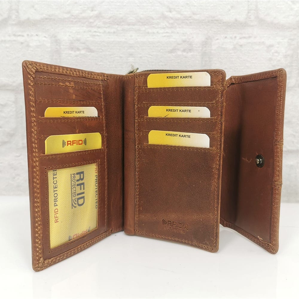 15 процепа за карти с различна големина, 4 от които са прозрачни, голям монетник с цип в него има 2 прегради