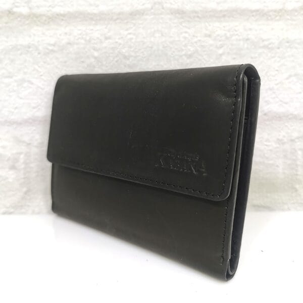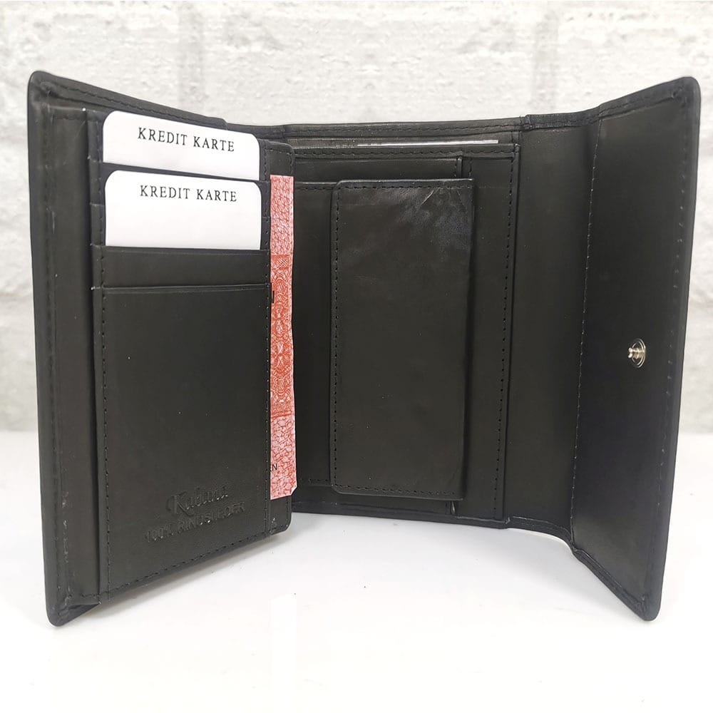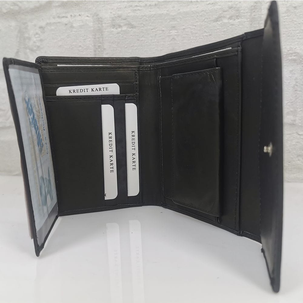 2 прегради за банкноти, 14 процепа за карти с различни големини, като 1 от тях е прозрачна, монетник с копче тик-так, отвън на гърба джобче