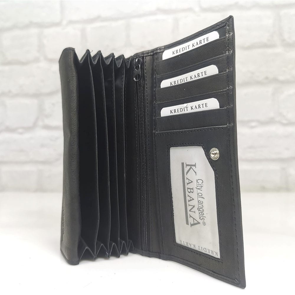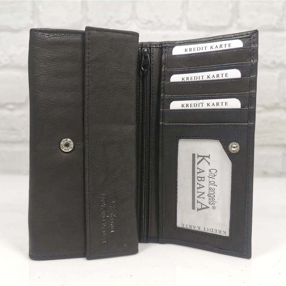 Шест прегради за банкноти , голям монетник с капак и копче тик-так, джоб с цип, 6 прегради за карти, като едната е прозрачна, на гърба джоб