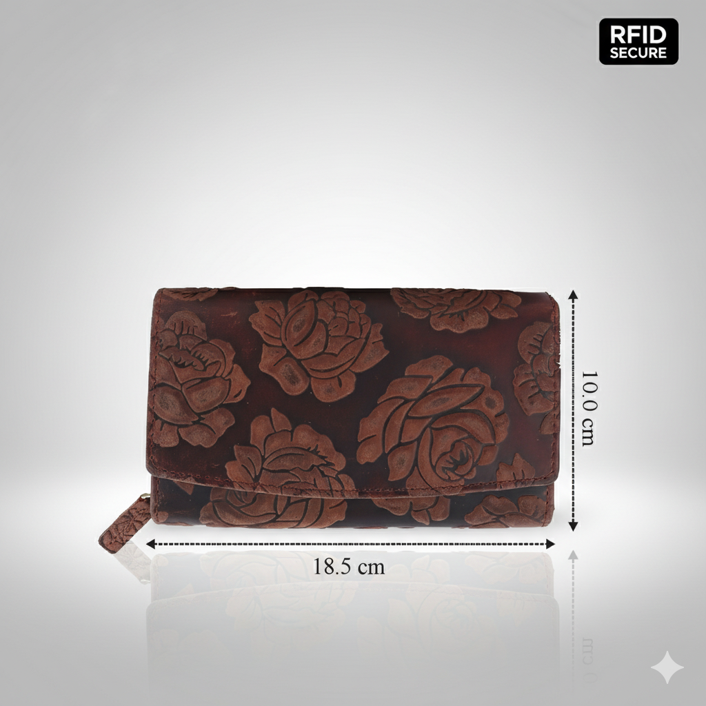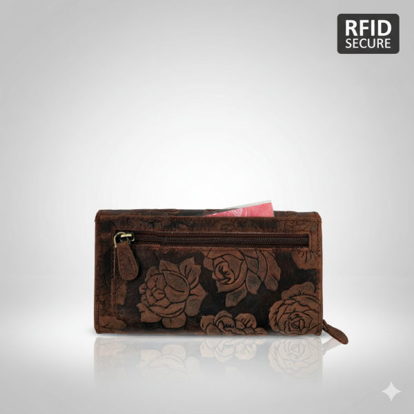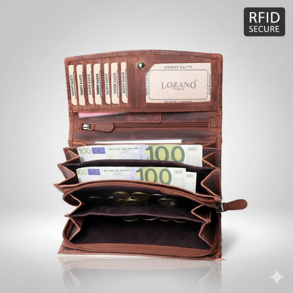 В основното отделение: 4 прегради за банкноти, голям монетник с цип, разделен на 2 с преграда, малко джобче за 1 житон или лонета за количките за пазаруване в супермаркетите, джоб с цип, отпред 6 прегради за карти. На капака 8 прегради за карти, като едната е прозрачна и една голяма преграда, отвън на гърба джоб без зкопчаване и един джоб цип.