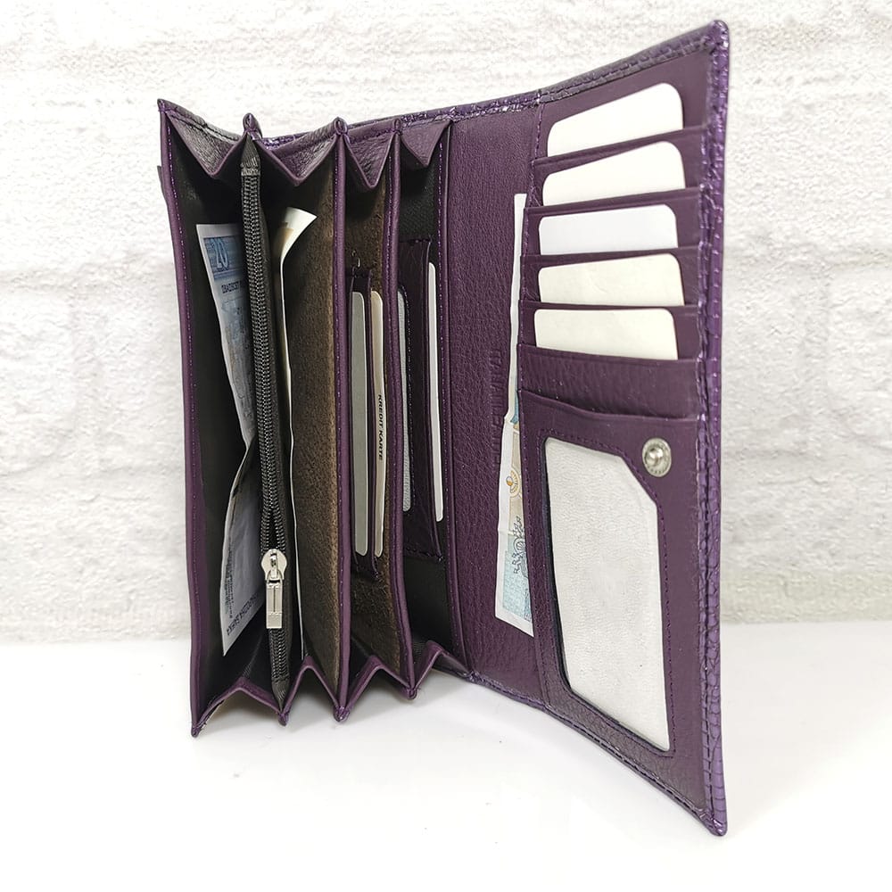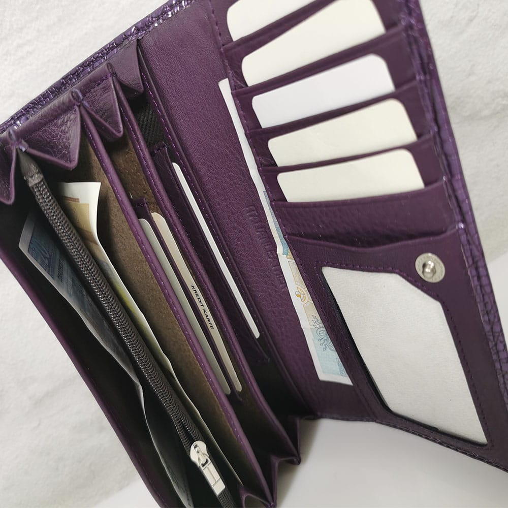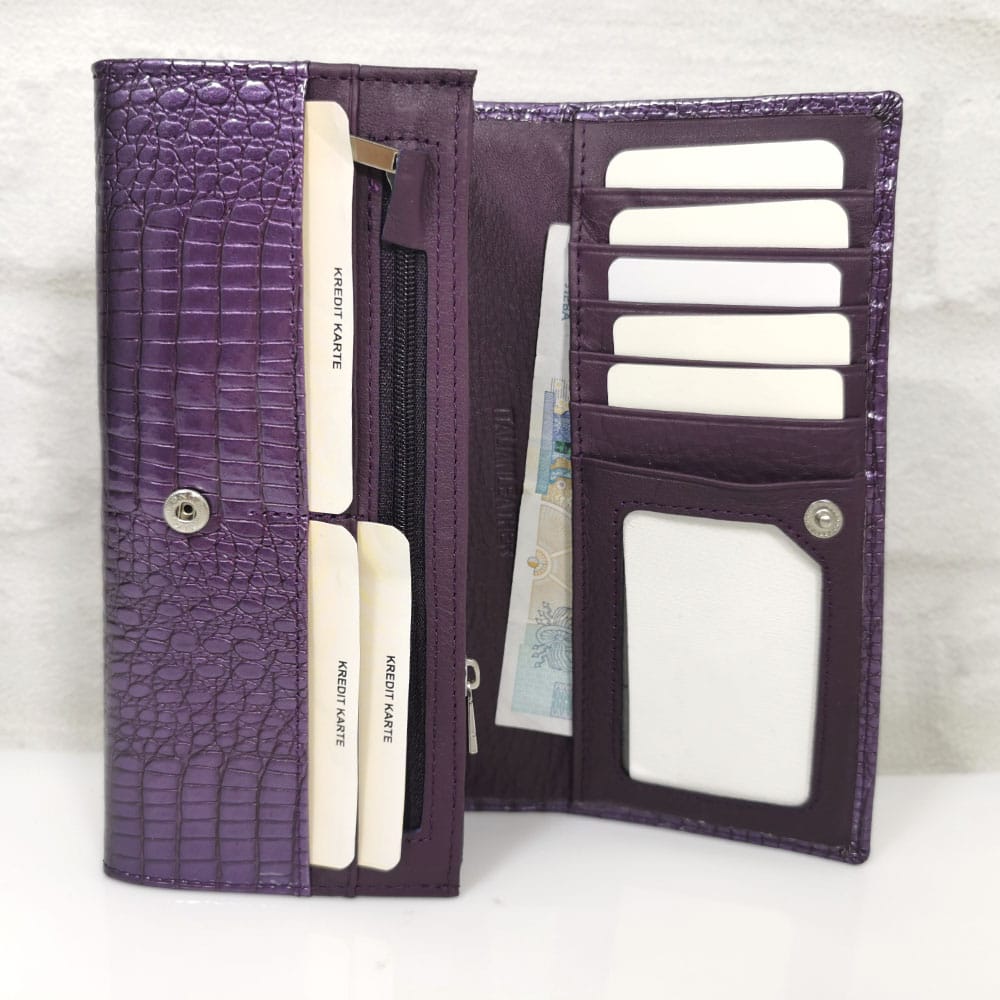 Отвътре-6 големи прегради за банкноти , монетник с цип, още един джоб с цип, 14 отделения за визитки или карти