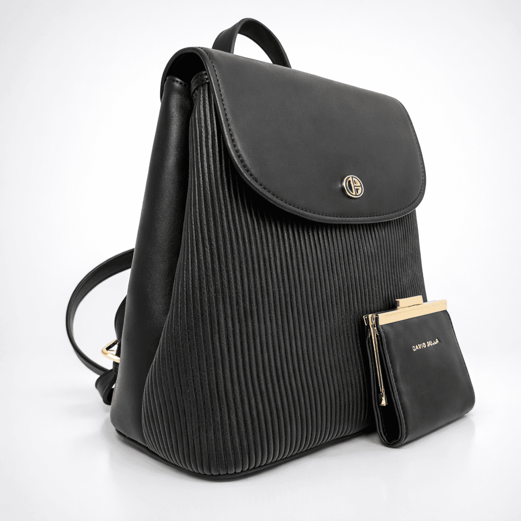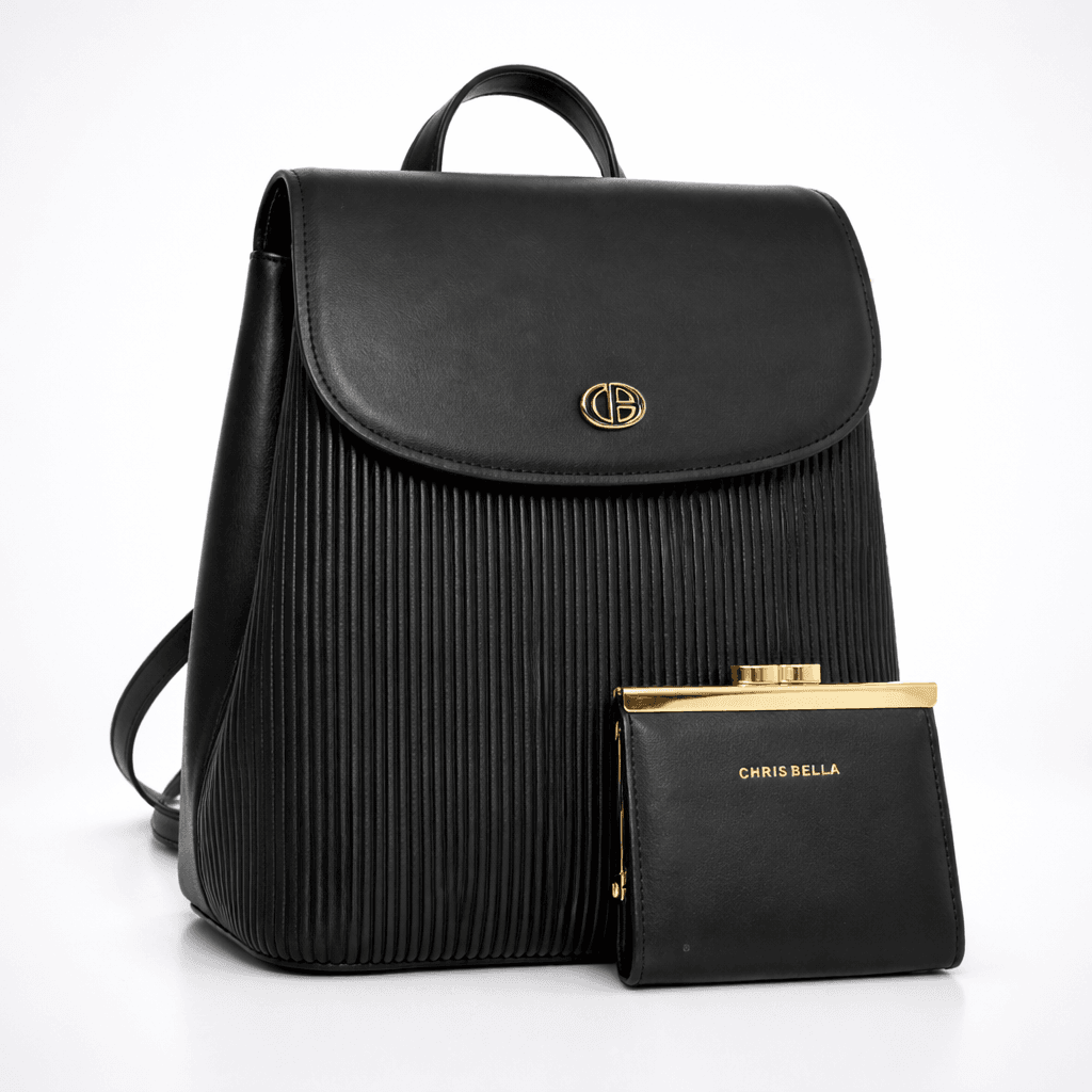 Елегантен комплект-елегантна дамска раница с релефен дизайн и портмоне със златиста рамка. Практичен и модерен аксесоар за ежедневие, който съчетава стил и удобство.