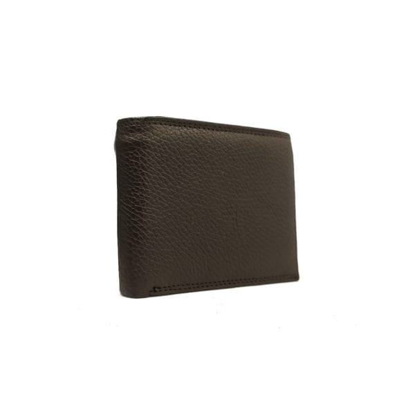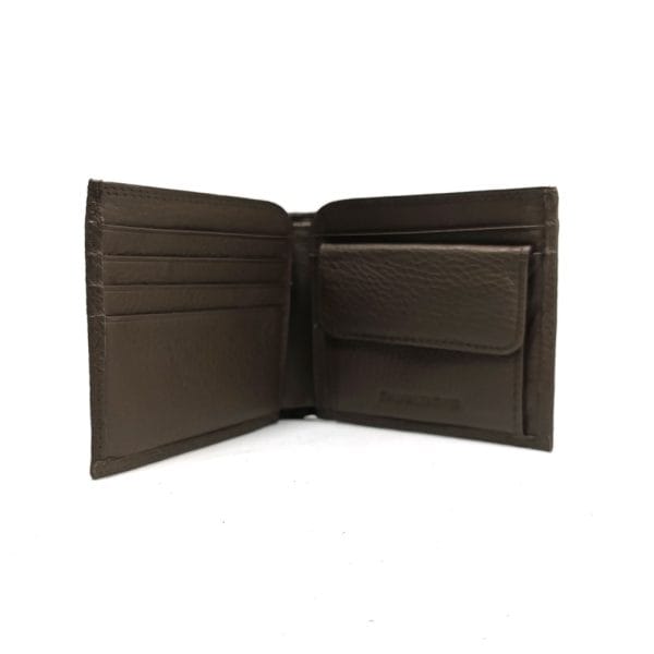 Кафяв кожен портфейл с изчистен дизайн и практично разпределение, без закопчаване. Има вътрешен монетник с копче тик-так.