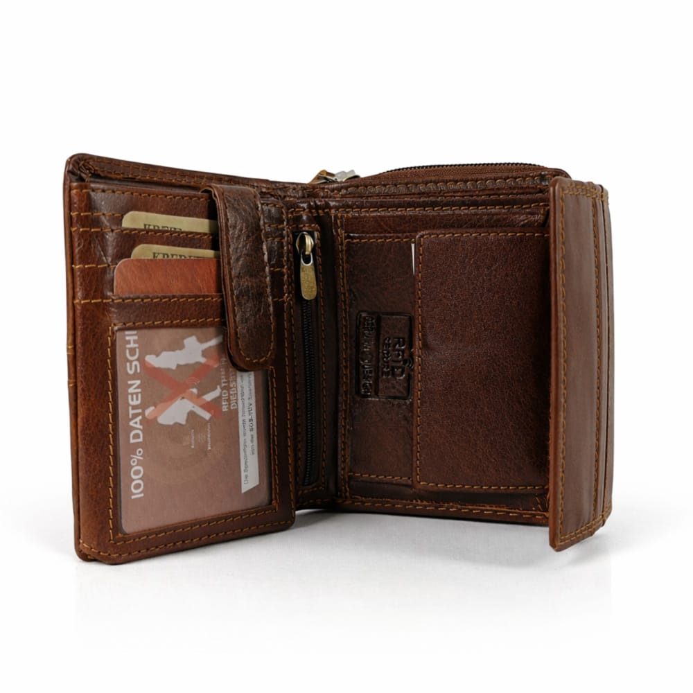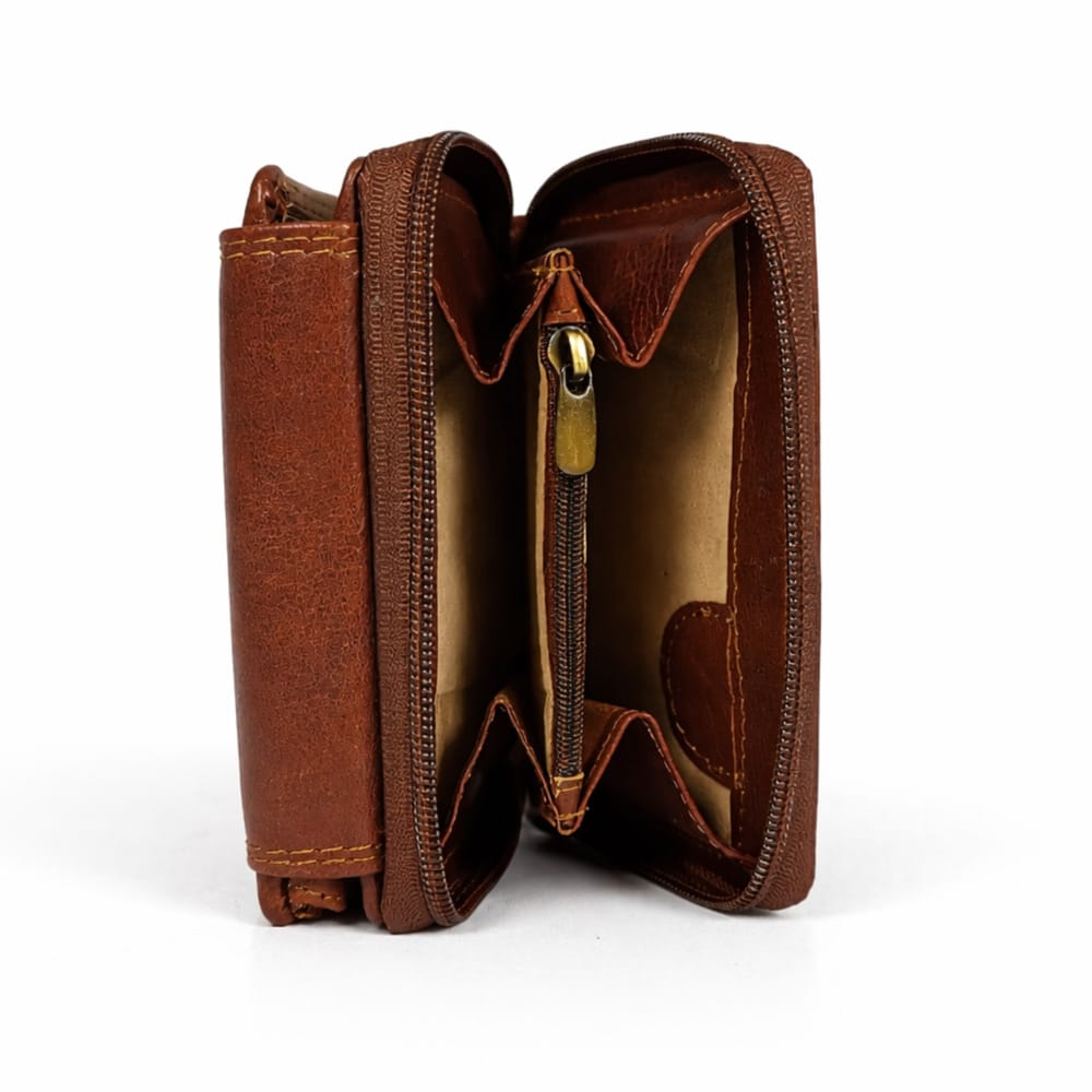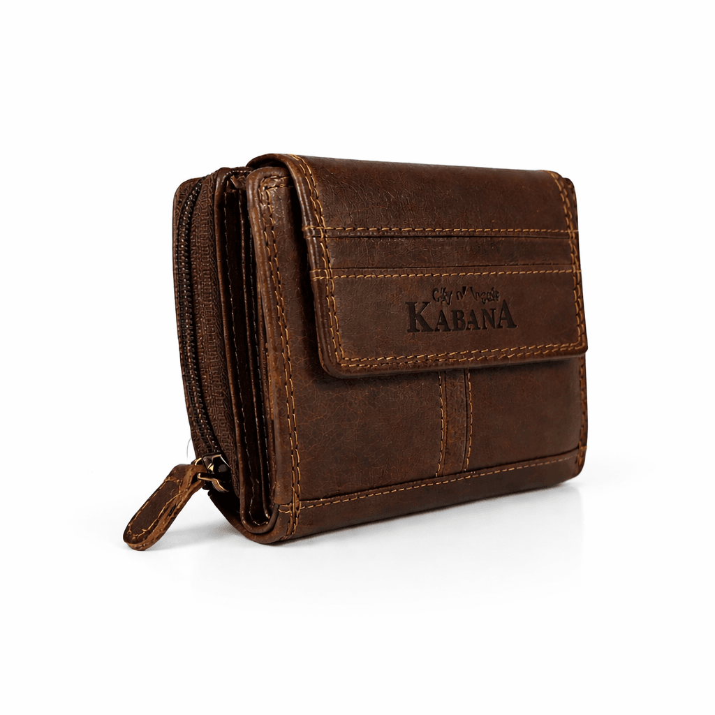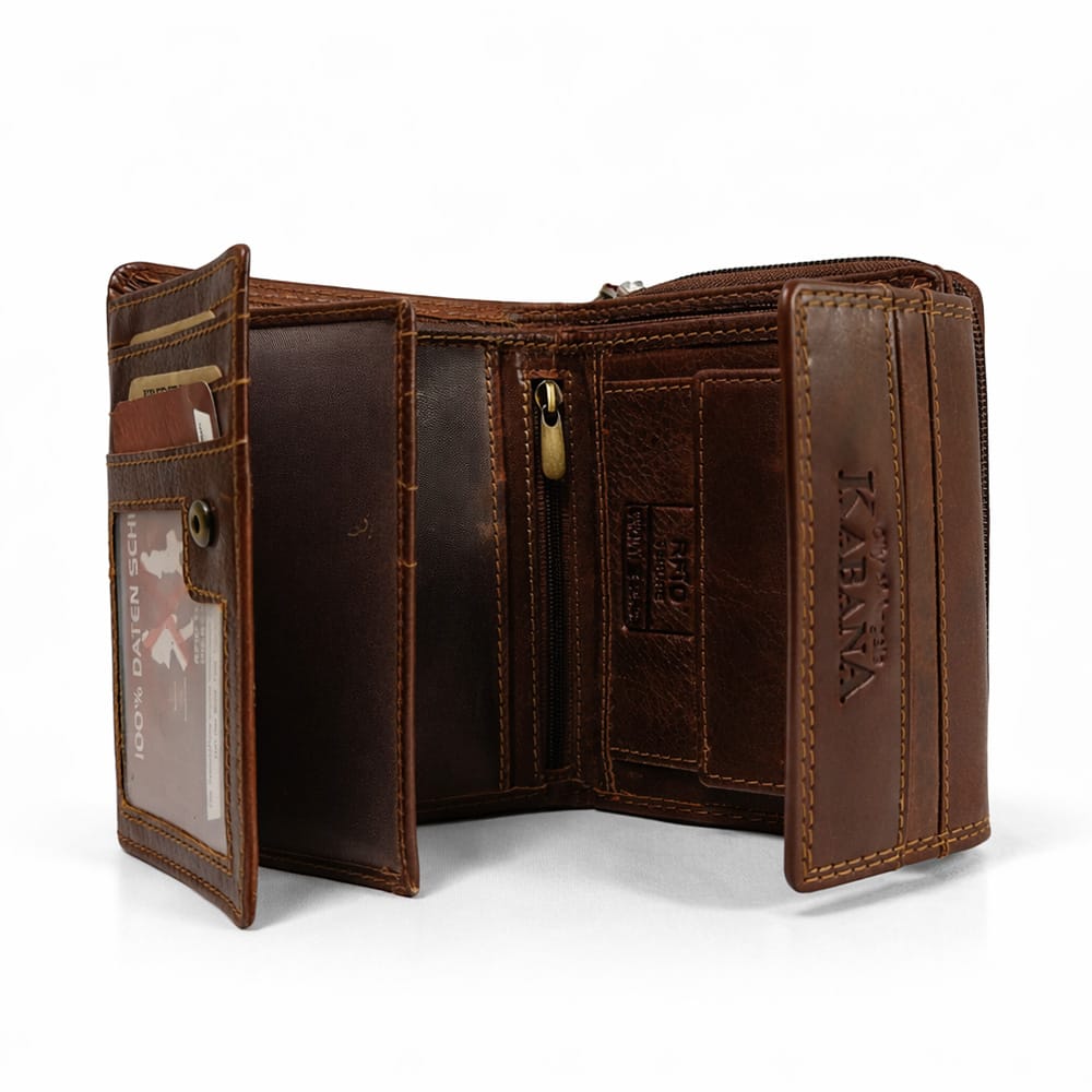 Кафяво дамско портмоне от естествена кожа в класически кафяв цвят, с удобно вътрешно разпределение за карти, банкноти и монети. Практичен модел за ежедневна употреба, съчетаващ стил и функционалност.