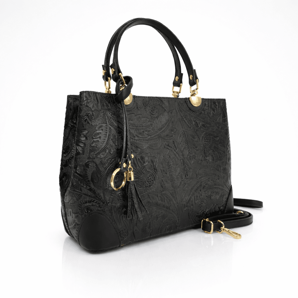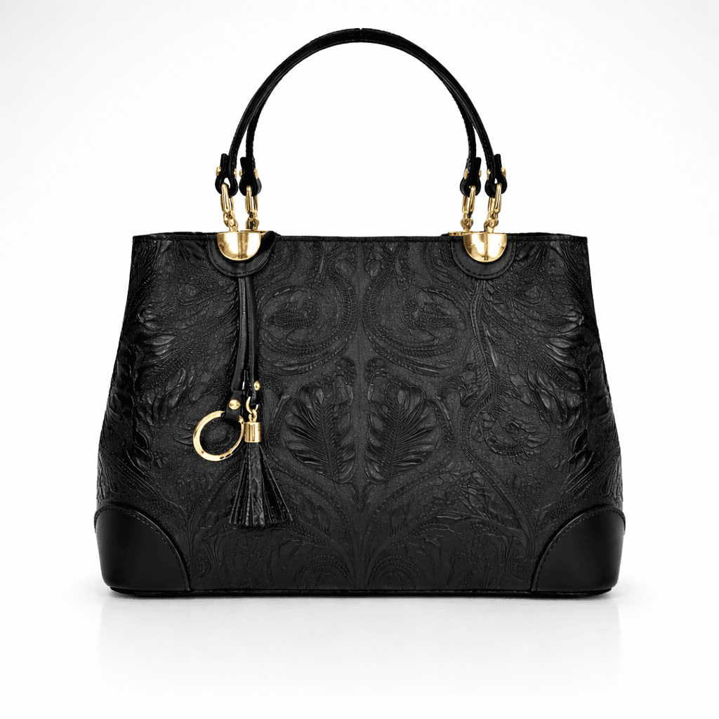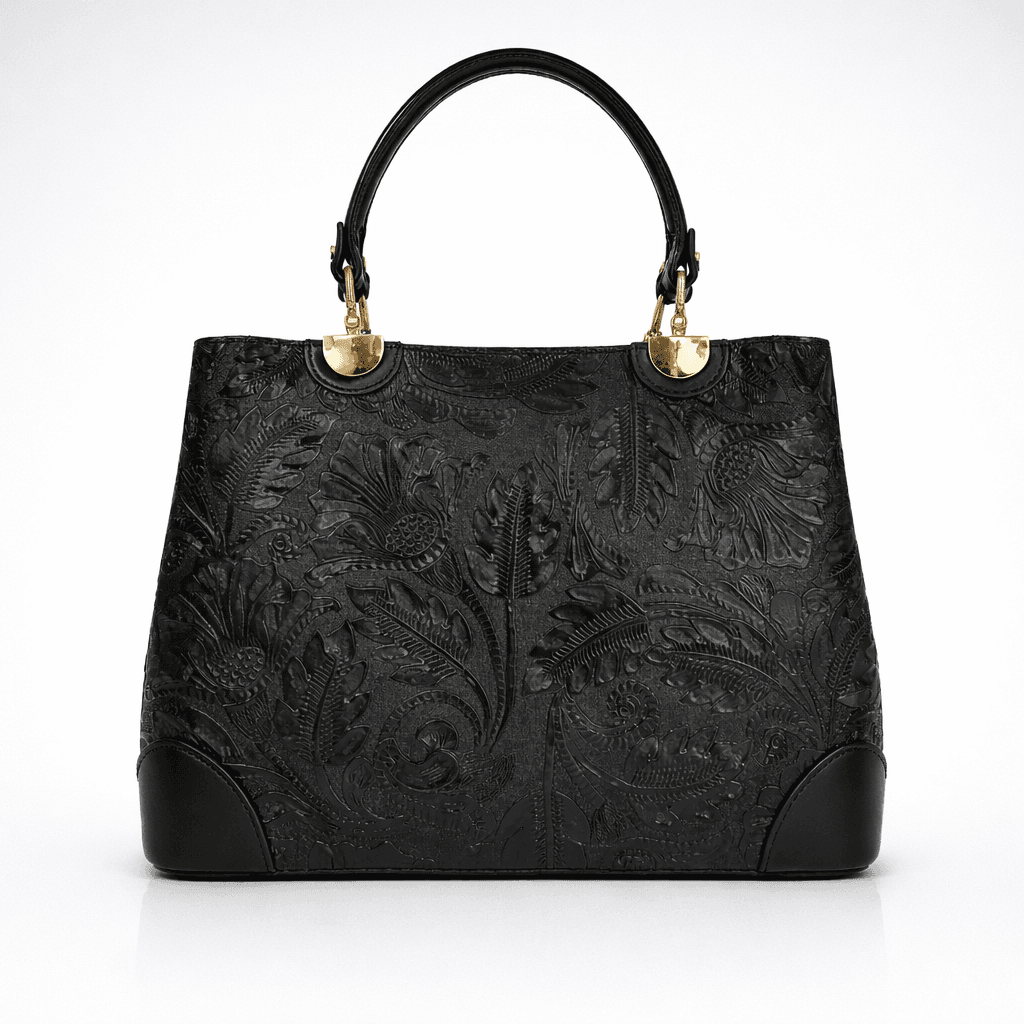 Естествена кожа с релефен флорален принт, хастар-полиестер, обков метален.