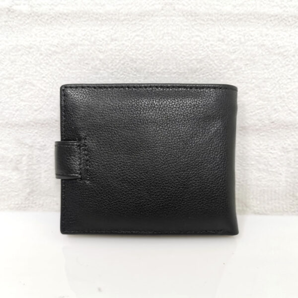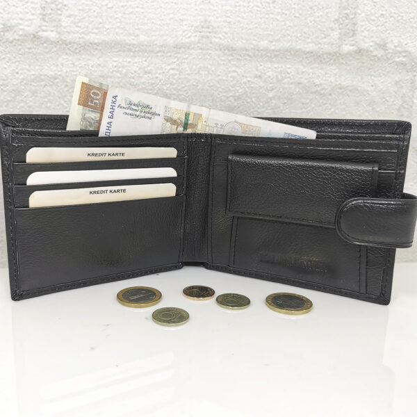 Три отделения за банкноти, като едното е с цип, 5 джобчета с различни размери за визитки или карти, монетник с копче тик-так.