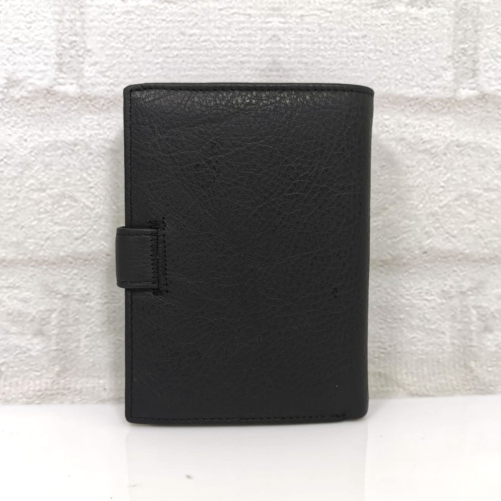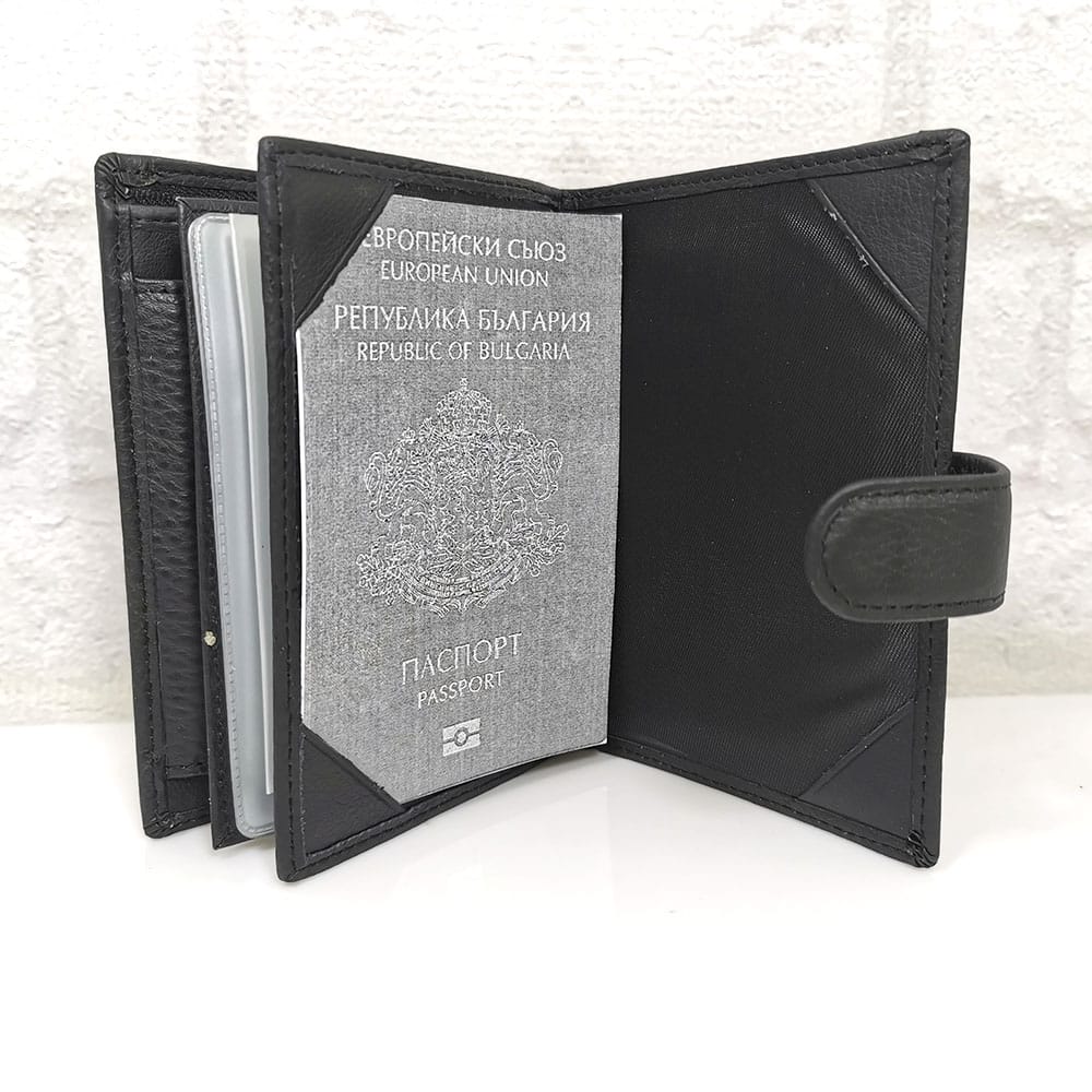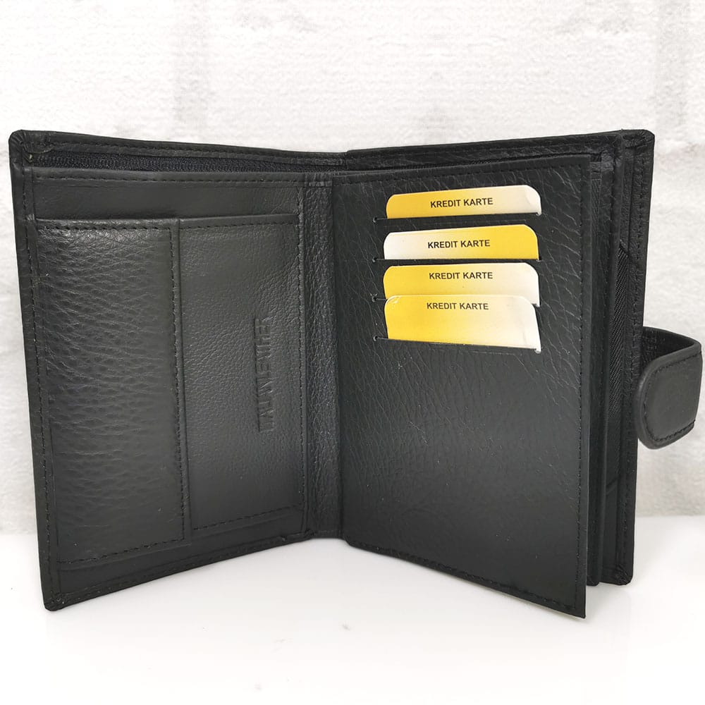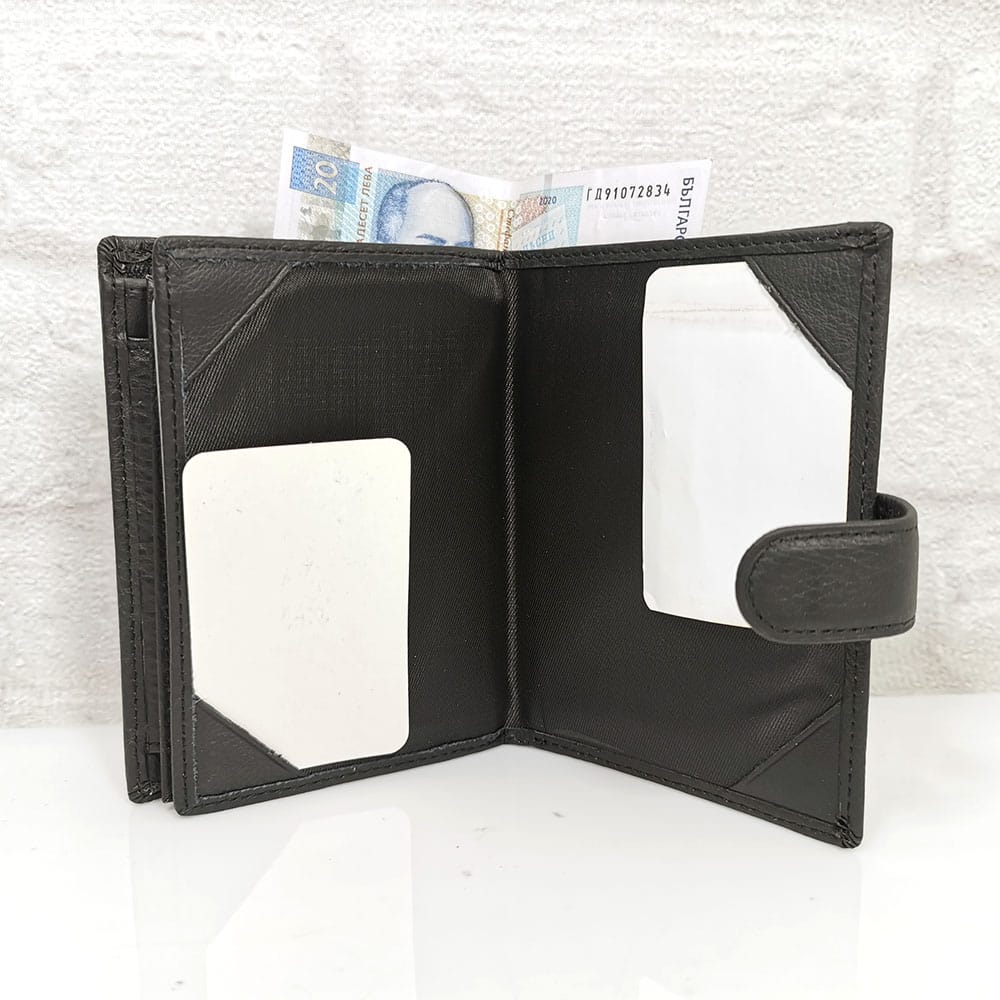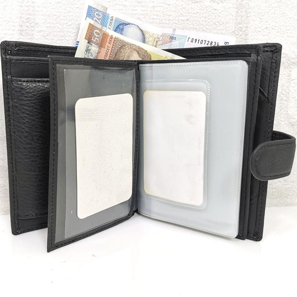 Три отделения за банкноти, като едното е с цип, 6 джобчета с различни размери за визитки или карти, като 2 от тях са прозрачни, 6 прозрачни джоба с различни размери, специално отделение за международен паспорт, монетник с копче тик-так.